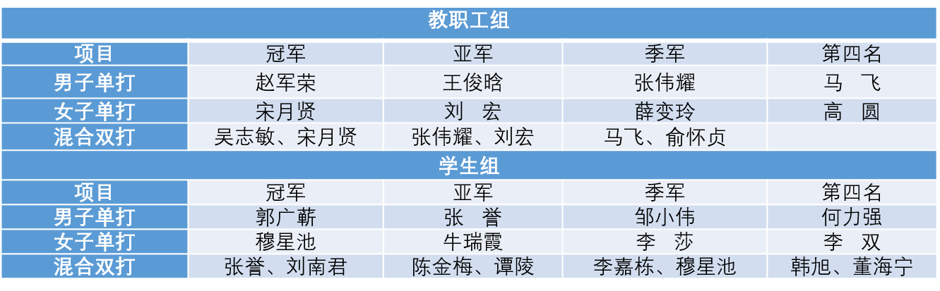 本次比赛分为教职工组、学生组,设为男单、女单和混合双打三个项目,采用积分制。选手们在现场直拍、横排、扣球、旋转球等,精彩的球技博得阵阵喝彩。最终,历过一下午激烈角逐,分别决出了各组的前四名。