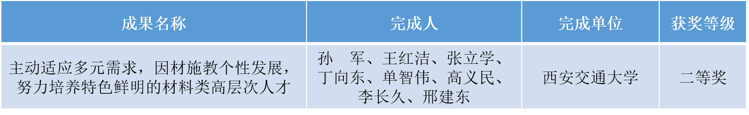 国家级教学成果奖代表了当前我国高等教育工作的最高水平,是彰显学校人才培养工作水平和教育教学改革成果的核心指标,每四年评选一次。本次获奖是西安交大材料学科历史上的第一次。