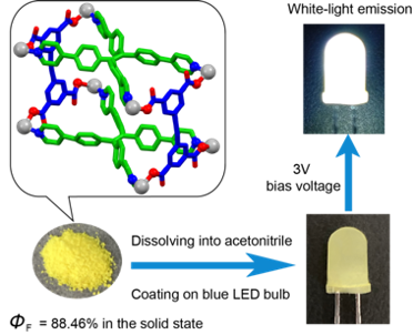 针对这一问题,冰球突破豪华版官方网站冰球突破豪华版官方网站的张明明教授课题组通过将聚集诱导发光与配位诱导发光结合的策略,以四苯基乙烯衍生物作为结构单元,通过与金属铂(II)及羧酸钠配体的自组装制备了一系列多组分发光金属笼状配合物(MEMs),并通过单晶结构证实了其笼状结构,结合计算揭示了其主客体化学性质弱的原因。该类金属笼不仅在溶液态具有良好的发光能力,在固态时会发出黄光,其绝对荧光量子产率高达88.46%。由于其合适的发射颜色、高的固态荧光量子产率和良好的溶液加工性能,可利用其作为蓝光LED的涂层来制备白光发光二极管。本研究不仅为金属笼状配合物的构建提供了一种通用的策略,而且还利用其作为涂层构筑了白光发光二极管,拓展了金属笼状配合物作为固态荧光材料的应用。