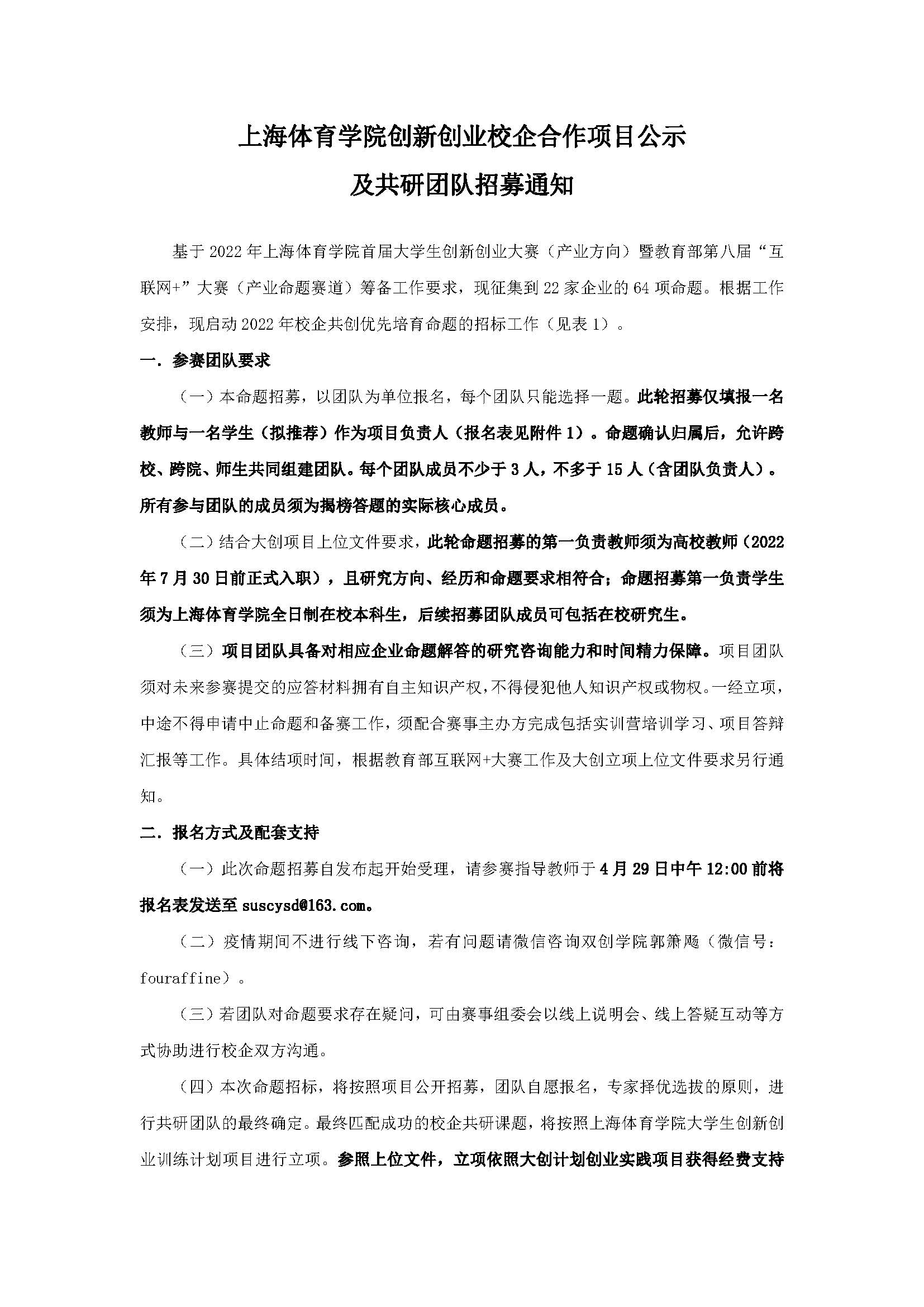上海体育学院创新创业校企合作项目公示及共研团队招募通知