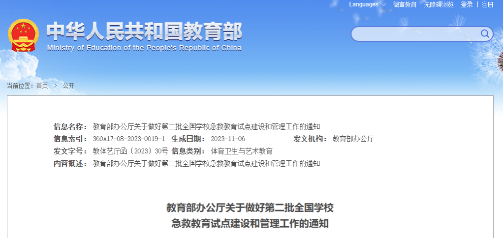 全国急救教育试点学校是为深入贯彻党的二十大精神,结合教育实际实施《健康中国行动(2019—2030年)》,推进落实《教育部等五部门关于全面加强和改进新时代学校卫生与健康教育工作的意见》部署的具体举措。根据《教育部办公厅关于开展第二批全国学校急救教育试点工作的通知》(教体艺厅函〔2023〕11号)要求,今年会以体育教育国家级实验教学示范中心(运动健康与康复实验教学中心)牵头,经学校申报、省级教育行政部门遴选推荐、专家复核、教育部综合认定并公示等程序,于2023年11月成功入选第二批1000所全国学校急救教育试点学校。