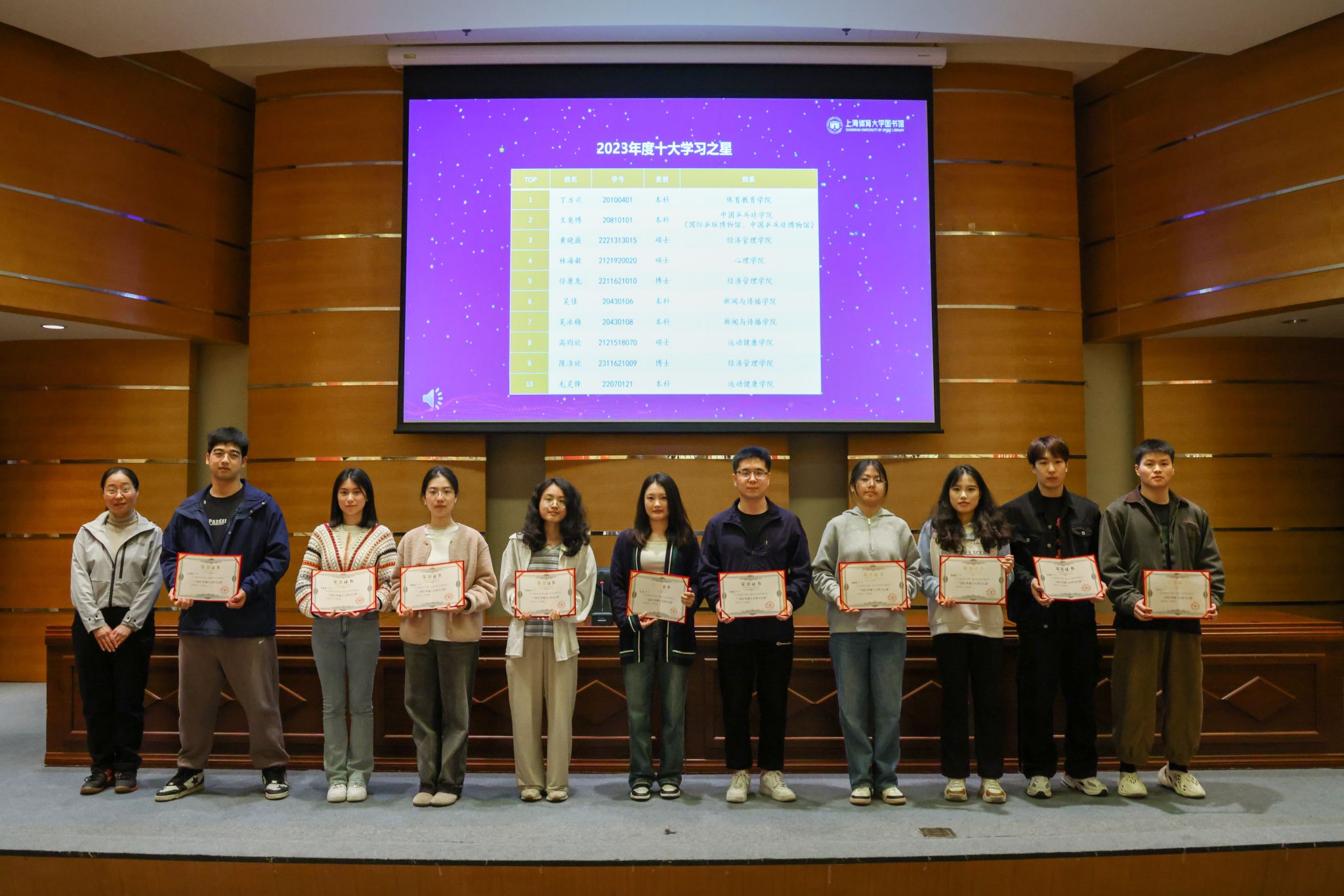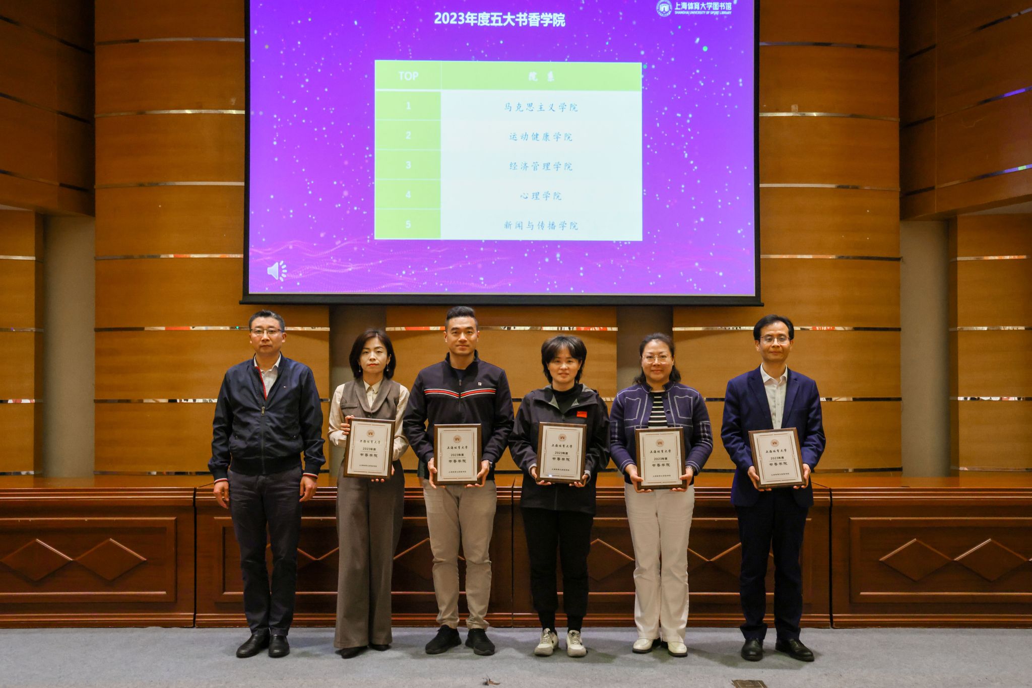 根据年度借阅纸质图书数量排行,罗均、於穆容、赵文倩、谭莉璇、潘青廷、何子佩、魏文慧、江建伍、陈道胜、张梦豪等获得2023年度十大阅读之星(学生组);范铜钢、陈国强、孙笑非、李延超、张业安、江 岩、邓佳煜、徐祎彤、蔡峰涛、贾颖华等获得2023年度十大阅读之星(教师组)。根据年度在馆累计学习时长排行, 丁方兴、王奥博、黄晓薇、林海敏、任康龙、吴佳、吴冰梅、高昀欣、陈洁欣、毛灵锋等获得2023年度十大学习之星。根据年度生均在馆学习时长排行,马克思主义学院 、运动健康学院 、经济管理学院 、心理学院 、新闻与传播学院等获得2023年度“书香学院”。
