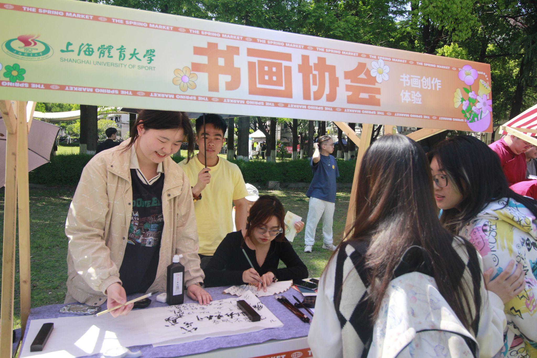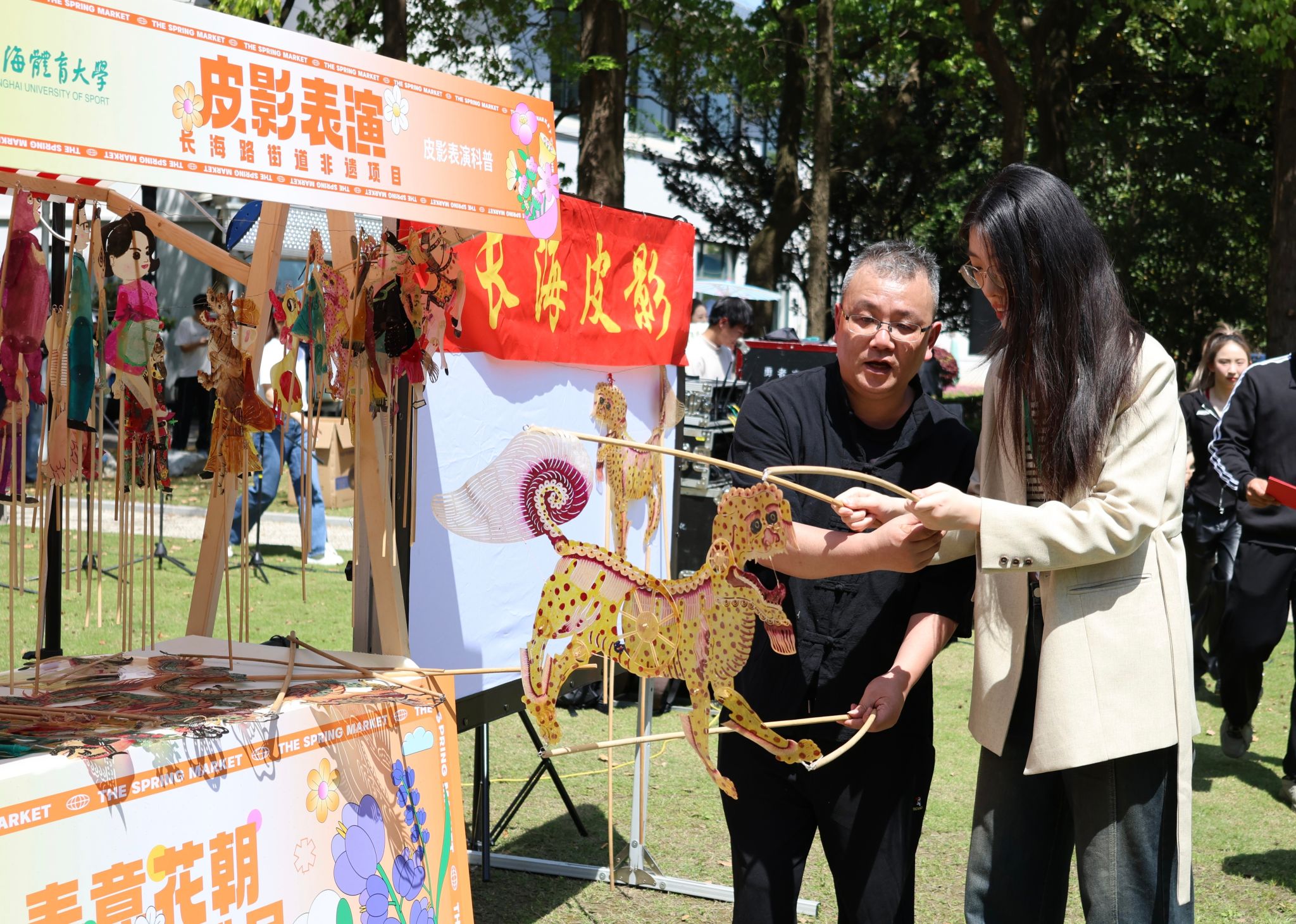 社团游园会有20多个社团精心准备了各类互动活动。校团委邀请了长海路街道非遗工作室“花样经剪纸”和“长海皮影”,上海应用技术大学的汉服社、上海外国语大学的沪语社的同学们与大家互动交流。还有今年会体教学院三民工作室的风筝制作、射艺协会的投壶和射箭游戏、围棋社的围棋体验、书画社的书画展示、伊人手工社的鲜花印染等等,吸引了众多同学的积极参与,让同学们在玩的过程中尽情享受传统文化的魅力。