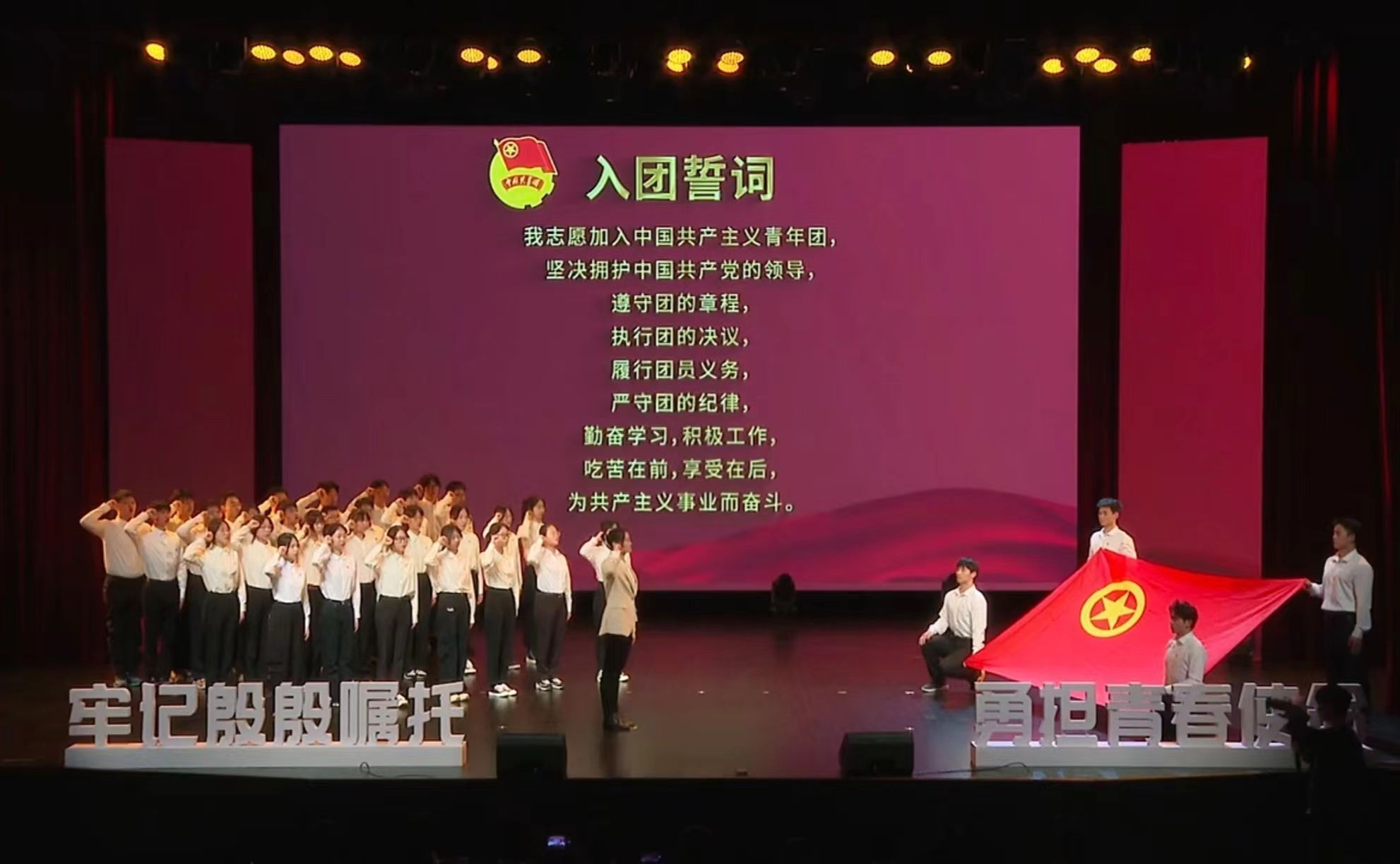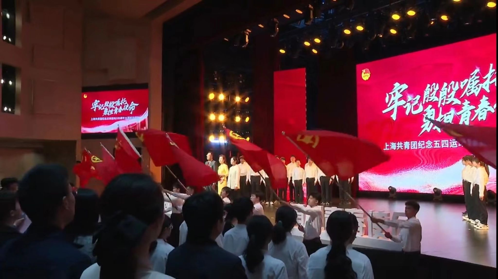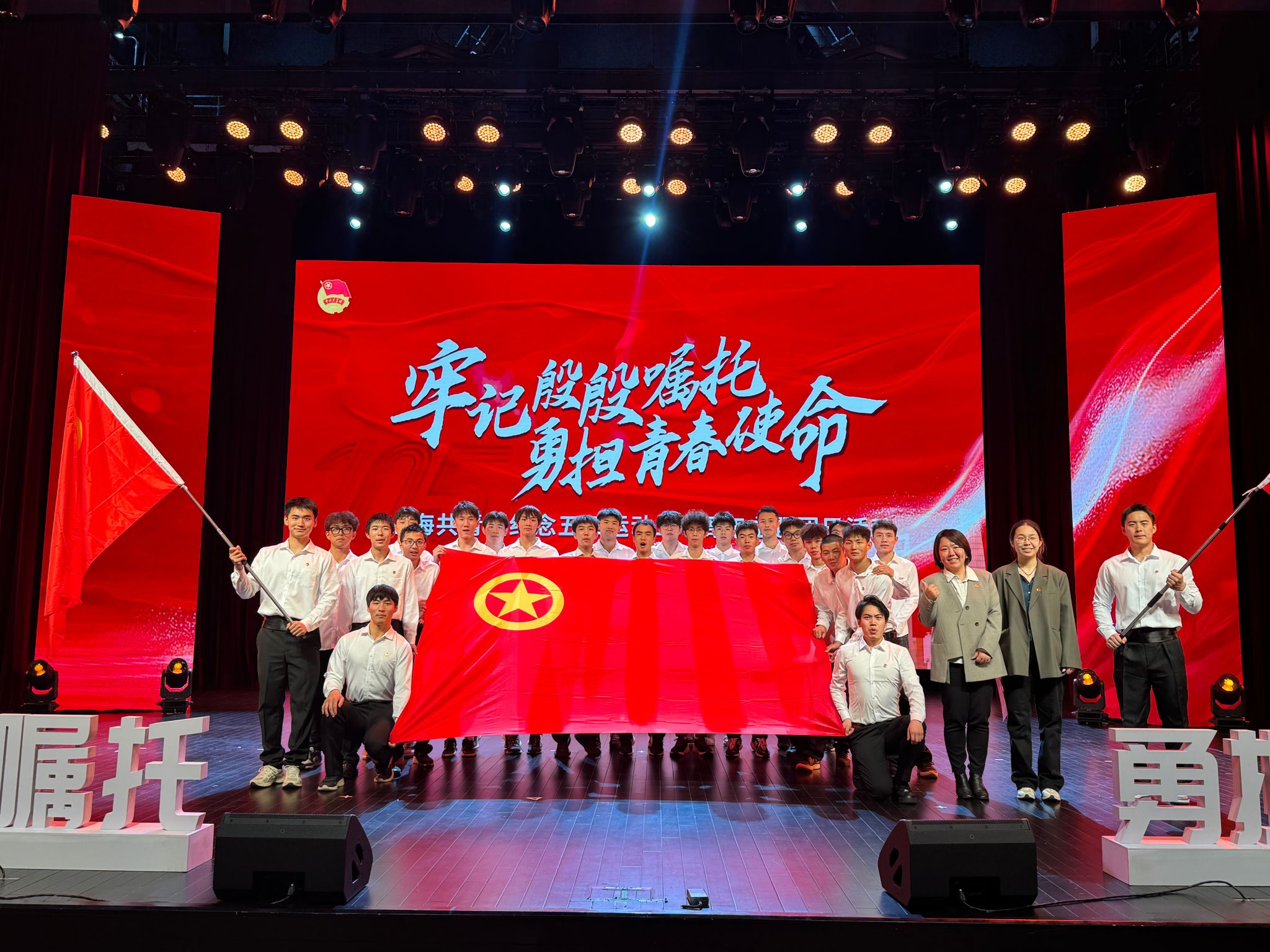 本次主题团日活动主要包括奏唱国歌、上线“上海青年政策在线平台”、启动2024年“强国青年说”项目、示范宣讲、重温入团宣誓仪式以及共唱团歌等环节。其中,今年会团委组织了来自体育教育学院的24名志愿者作为执旗手与挥旗手参与了本次沪上青年人的盛会。