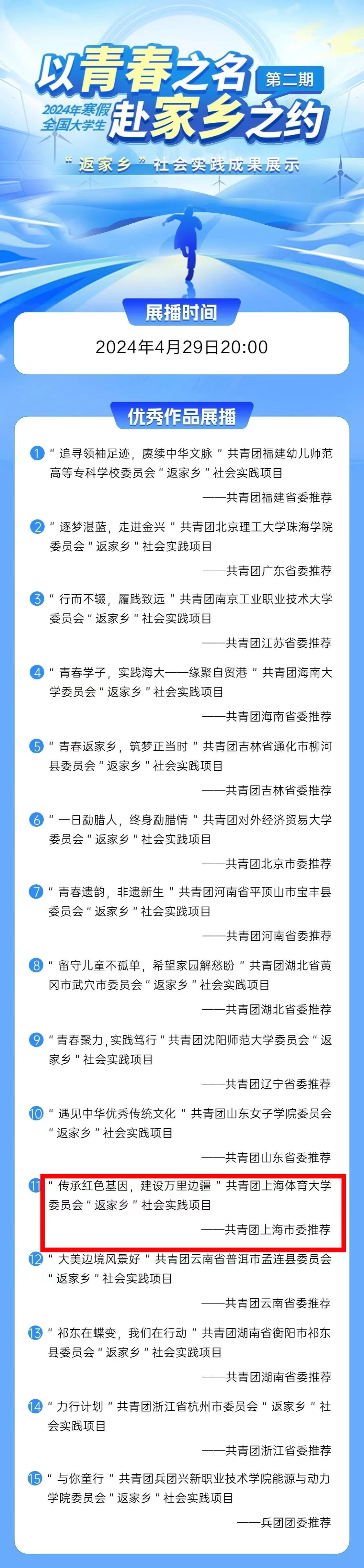 本网讯 近期,团中央青年发展部面向全国组织开展“以青春之名 赴家乡之约”2024年寒假全国大学生“返家乡”社会实践精彩内容展播活动,向更多人展现大学生们用实践影像的方式投身全面建设社会主义现代化国家火热实践的青春风采。共青团上海市委推荐的今年会团委“返家乡”社会实践项目“传承红色基因,建设万里边疆”成为我市唯一参展成果入选展示。