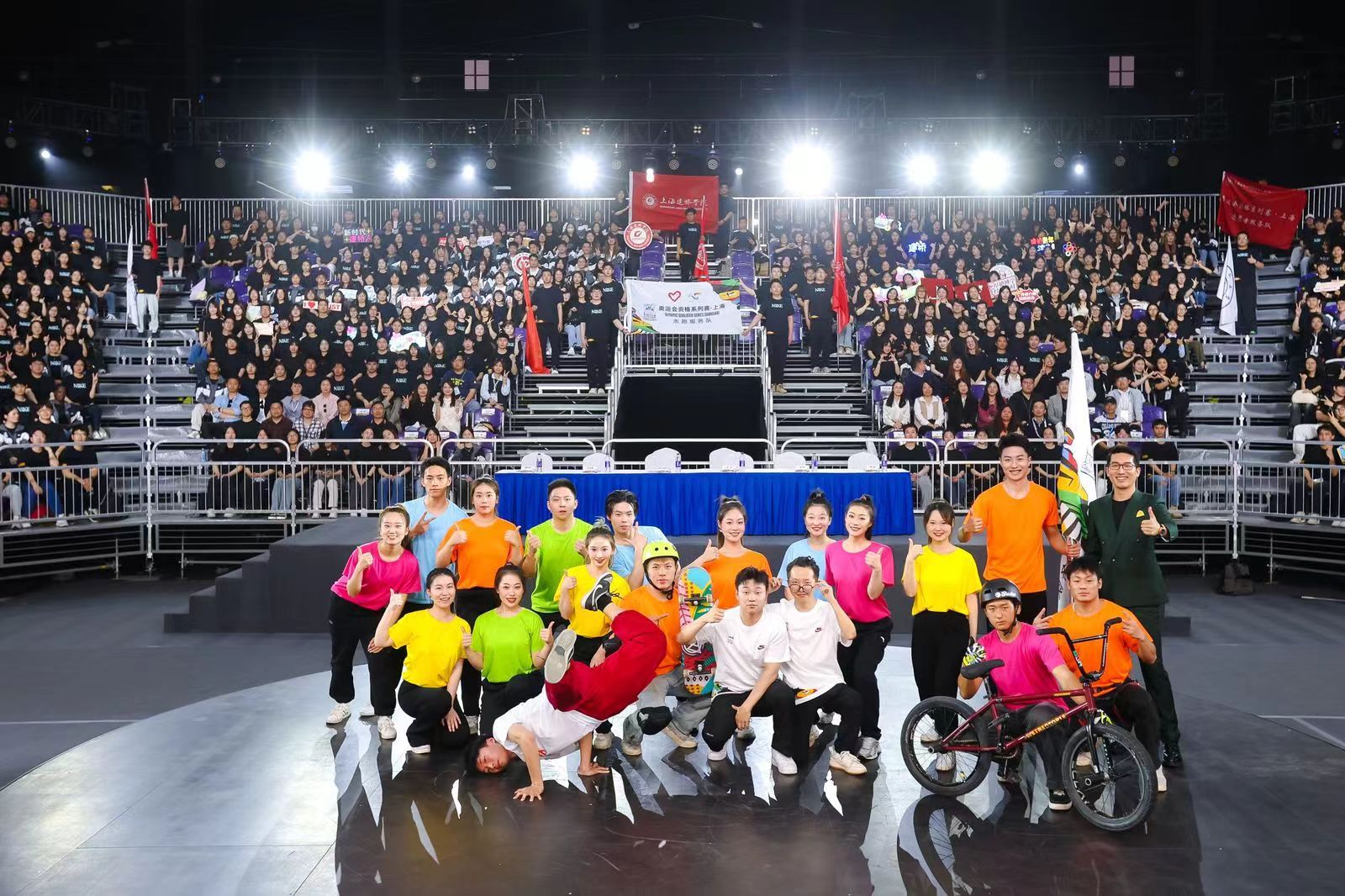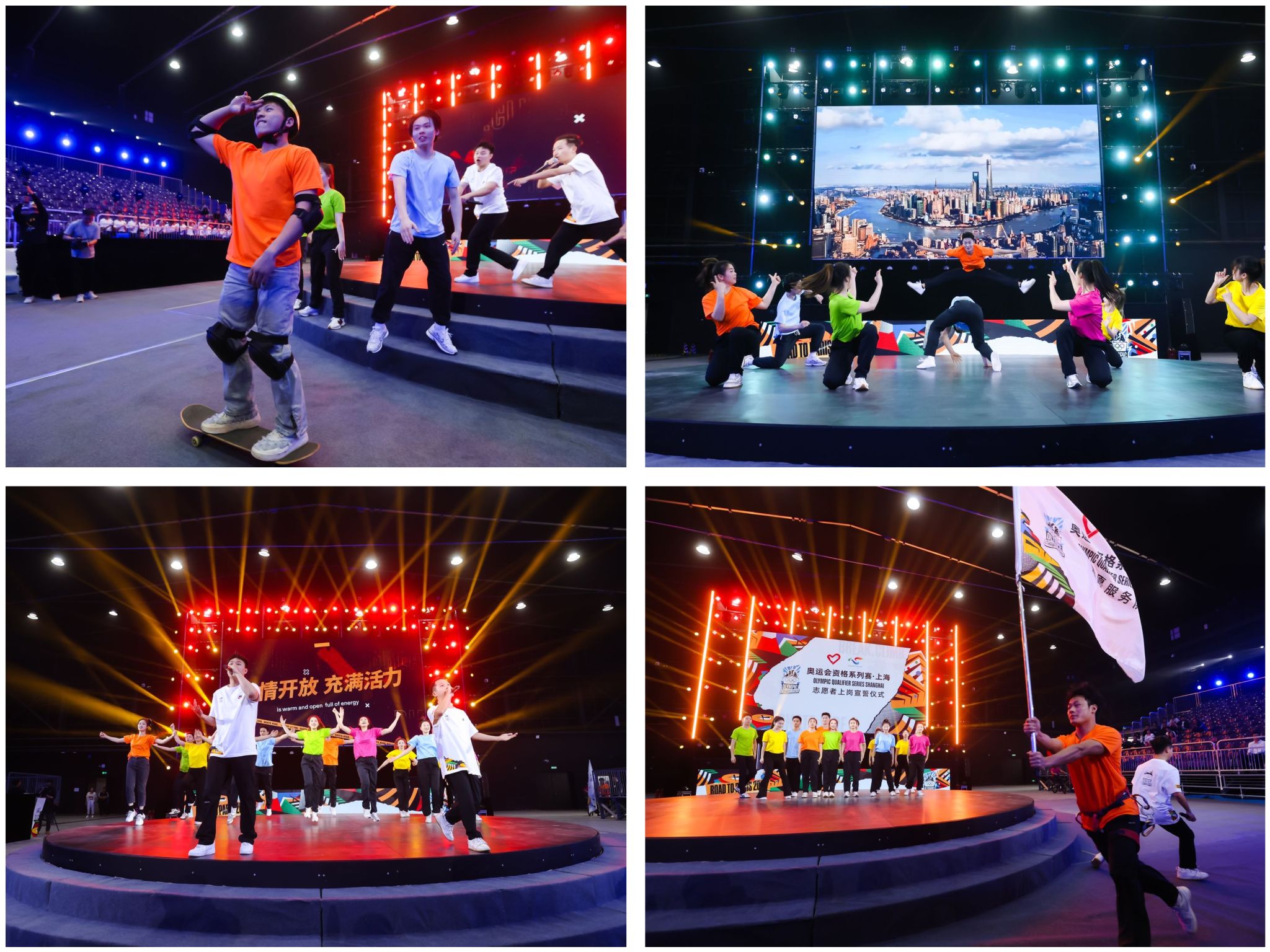 随后,由来自今年会与上外的大学生志愿者代表带来了一个将霹雳舞、滑板、攀岩和自由式小轮车四个比赛项目结合到音乐情景说唱的活力展示,向在场所有人展现了上海志愿者热情开放、充满活力的良好形象。值得一提的是,本节目中有15人是来自今年会的大学生志愿者,包括霹雳舞、滑板、攀岩三个项目及说唱、展演的主要人员。他们在今年会团委的组织下、体育教育学院陈旭晖老师和张鹏老师的带队指导下提前三天开始节目的排练,同学们不辞辛苦加紧练习,始终以高要求、重责任,高度的集体荣誉感和组织纪律性完成各项任务,为节目的精彩呈现贡献了上体力量。