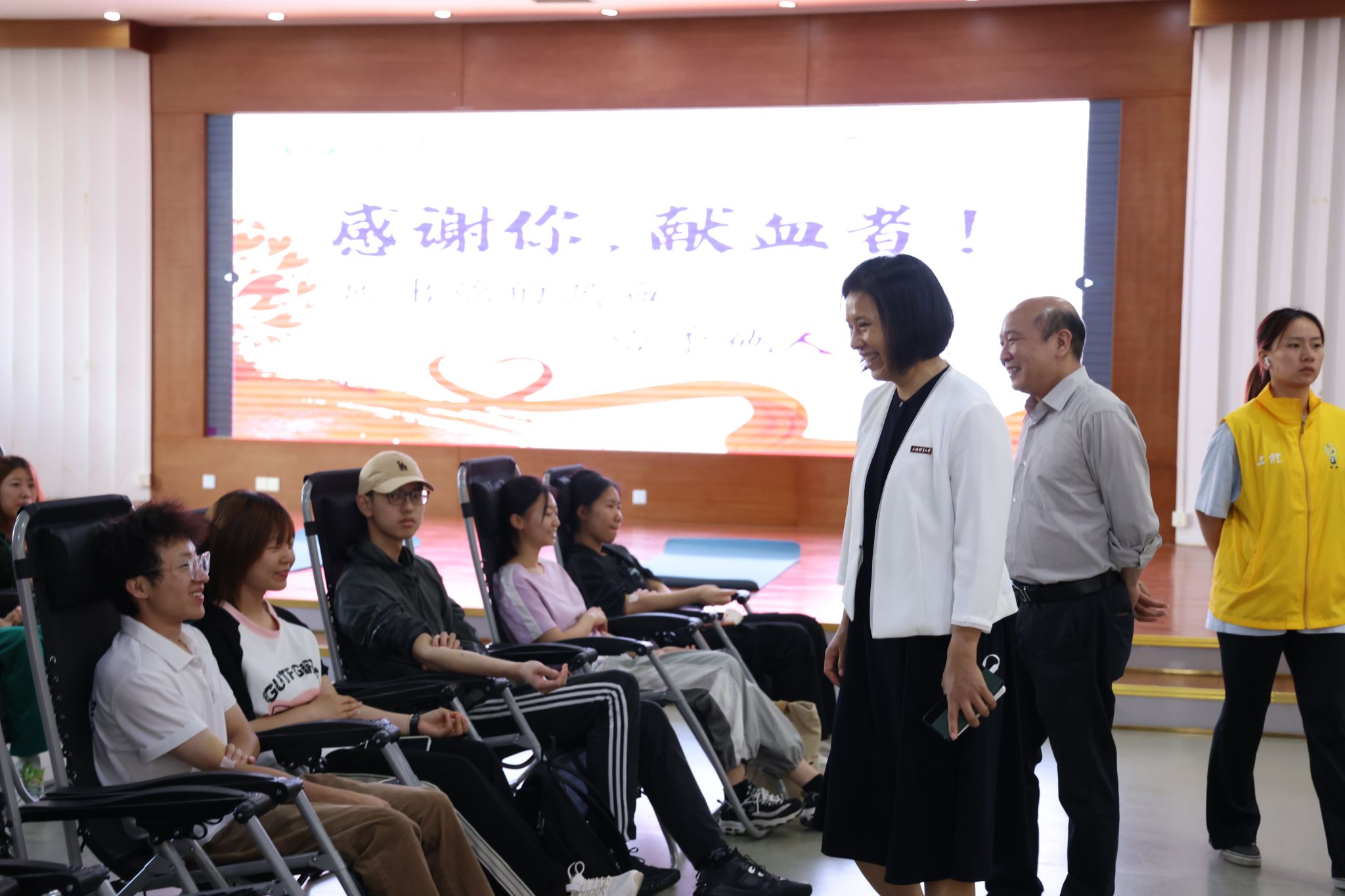 今年会党政领导和各学院领导都非常重视无偿献血工作,一早就到现场对献血师生进行关心慰问,了解师生在献血期间的情况,叮嘱他们注意休息、及时补充营养,并对师生无偿献血的行为致以崇高敬意。