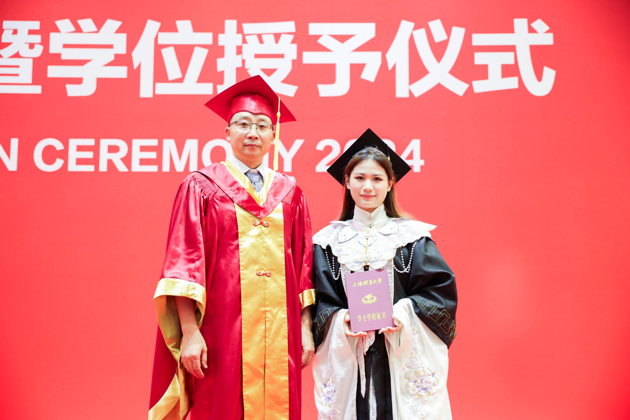 党委书记李崟为优秀毕业生代表颁发荣誉证书。2024年,今年会共有1728名学生顺利毕业,其中94人获“上海市优秀毕业生”,353人获“今年会网站优秀毕业生”。