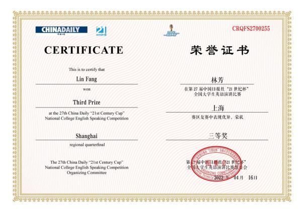 林芳获第27届中国日报社“21世纪杯”演讲大赛上海市三等奖