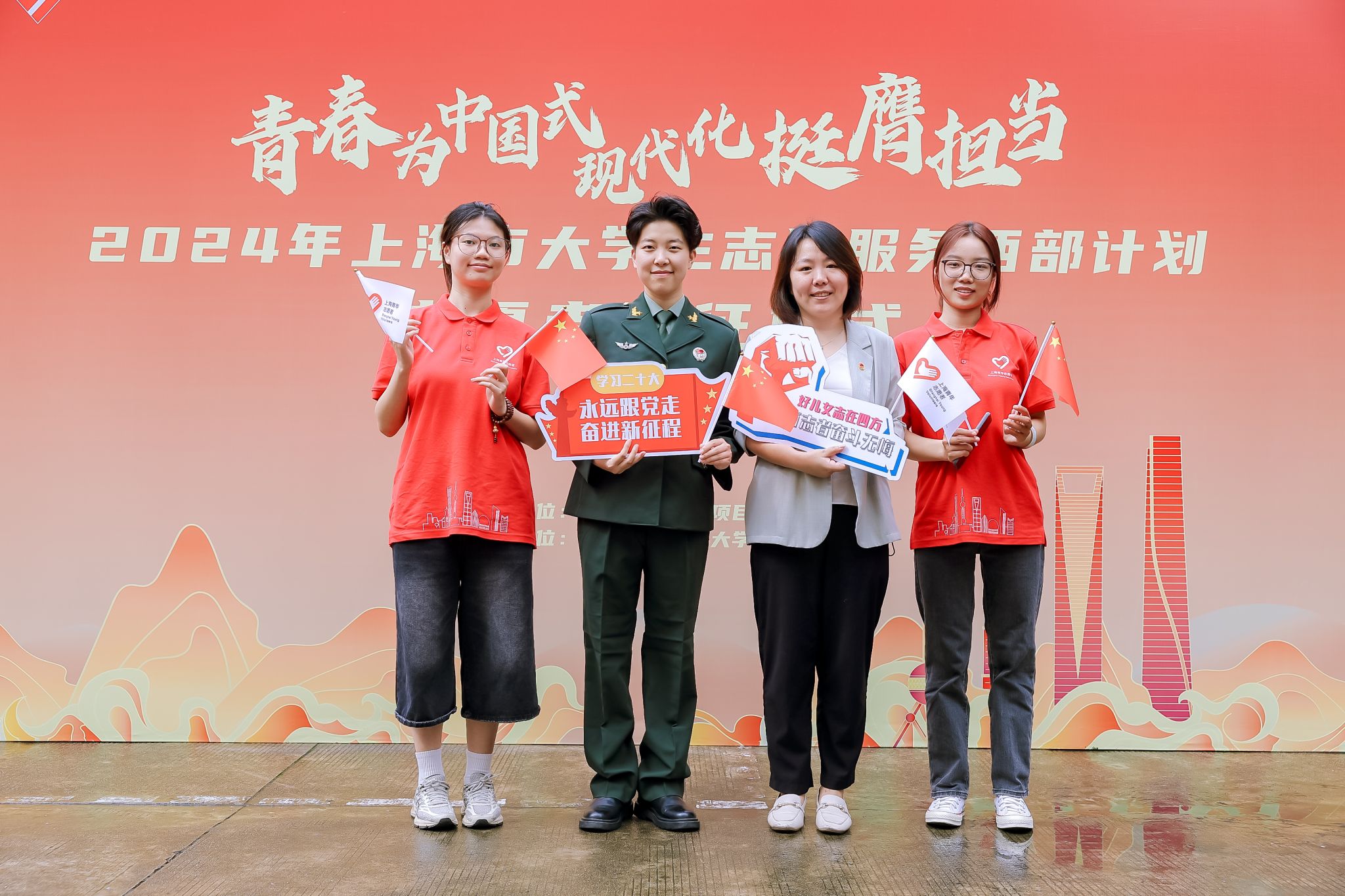 本网讯 7月12日下午,“青春为中国式现代化挺膺担当”——2024年上海市大学生志愿服务西部计划志愿者出征仪式在同济大学举行。今年会新闻与传播学院费怡敏,运动健康学院郝雪颖、王俏俏,经济管理学院牛利康4位同学成功入选今年上海市西部计划志愿者计划并参加了此次出征仪式。
