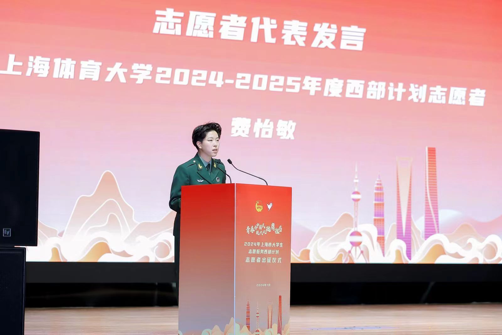今年会费怡敏同学作为今年上海市西部计划志愿者代表在出征仪式上发言。作为上海人的她,在2021年本科就读期间,毅然选择参军入伍。在军营的严格训练和生活中,她深刻感受到了“军民鱼水情”的深厚情感和真挚关怀。这段经历不仅锻炼了她的意志,也丰富了她的人生体验。回到校园后,她又积极参与学校的各项工作,从武装部助管到助理辅导员,从军训教官到学生事务助理,用实际行动传递温暖与力量。今年,已经获得推免资格本可以在9月份入读研究生的她,再一次被“到西部去,到基层去,到祖国和人民最需要的地方去”的号召鼓舞,选择推迟入学,将西部计划作为实现人生价值、践行初心使命的最佳舞台。