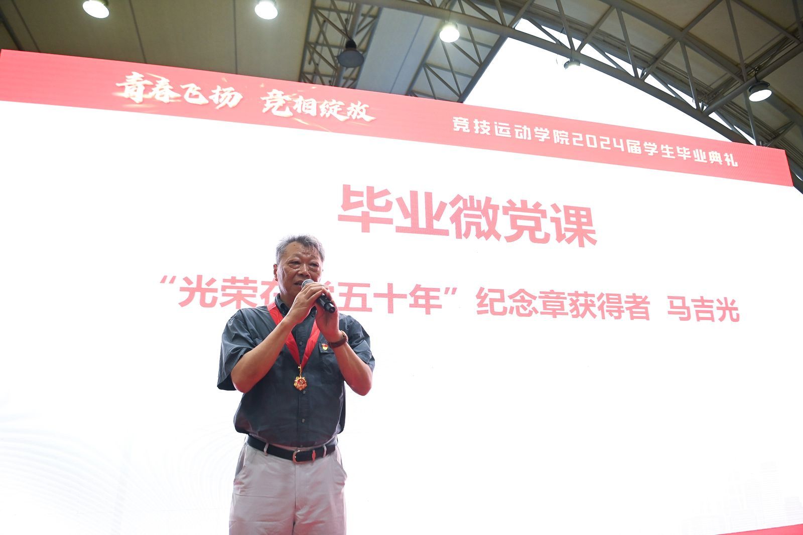 各二级学院抓住为老党员颁发“光荣在党50年”纪念章这一契机,对毕业生进行党课教育,产生了极好效果。如竞技运动学院2024届学生毕业典礼上,“光荣在党50年”纪念章获得者、退休教师马吉光为全体毕业生带来最后一节毕业生专题党课。马老师结合自身在党五十年、工作四十年的历程,表达了对党和学校给予自己长期教育和培养的感恩之情,也以此勉励同学们坚定理想信念,传承红色基因,坚守工作岗位,努力学习进步,把个人理想融入到党和人民的事业中去。