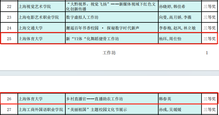 艺术实践工作坊(杨珏和周仕怡指导:《新“YI体”化舞蹈健骨工作坊)》,韩春英指导:《乡村直播官——直播助农工作坊》)获上海市三等奖。《新“YI体”化舞蹈健骨工作坊)》项目“以体为本”体现校园特色,通过对687名不同专项二级运动员的骨密度进行了相关实验研究,从中捕捉提取出12组对钙质吸收显著有效的体育动作类型作为舞蹈动作创编来源,基于运动生物力学,从而研究思考如何利用这些运动类型的作用和关系,科学的进行健骨舞蹈编排。“以艺为美”,基于艺术学,融合中华传统舞蹈的艺术风格,推动体艺文化融合、中华优秀传统文化的发展,坚守中华文化立场。“以艺一统身心”“以医为核”,舞蹈健骨创编达到“人人健康,人人舞”的效果。