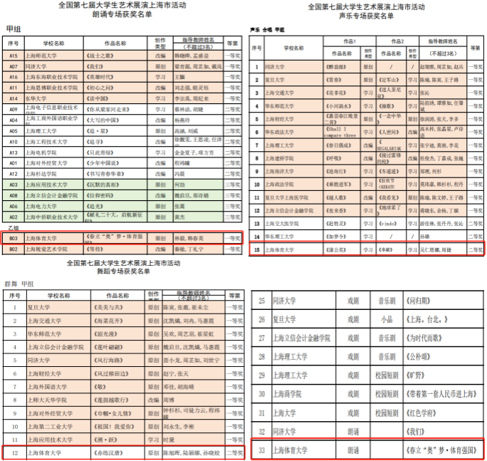 本网讯 7月23日,上海市科艺中心公示了全国第七届大学生艺术展演上海市活动获奖名单,本届展演坚持以社会主义核心价值观为引领,以“厚植家国情怀,涵养进取品格”为主题,去年下半年以来今年会根据市教委的统一部署,各项作品围绕体育特色,将体育与美育融合,探索“体艺融合”的实践育人路径,将课堂与实践结合,打造“五育并举”的育人模式。积极将艺术展演与艺术课程、艺术社团、校园文化建设相结合,与重大历史事件纪念日和传统节日相结合,积极发动全体学生参与内容丰富、形式多样的校级展演活动。今年会共70余名师生克服困难,利用业余时间参与编创和排演,呈现出良好的艺术表演水准。经过上海市的展演评比,今年会共报送上海市13个作品,全部获奖。其中4个上海市一等奖(其中1个项目获国家级一等奖)、6个上海市二等奖、3个上海市三等奖。