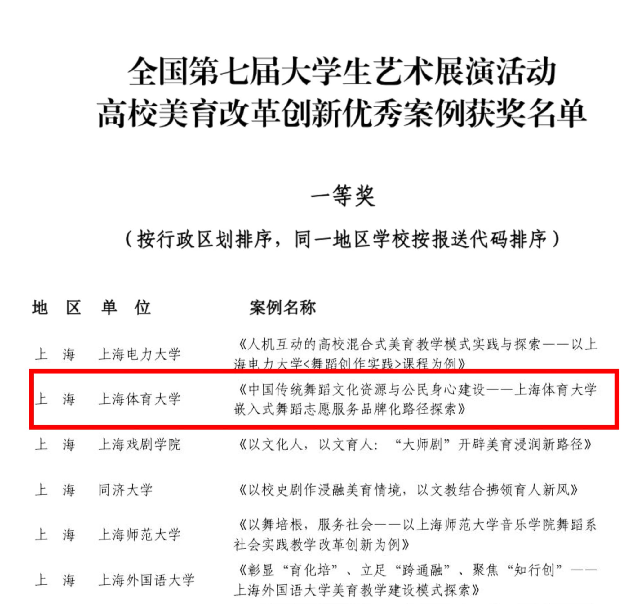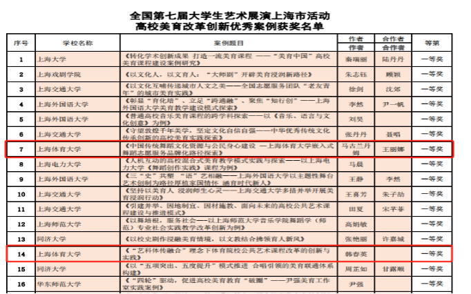 在全国第七届大艺展上海市展演中,高校美育改革创新优秀案例(马古兰丹姆、王丽娜:《中国传统舞蹈文化资源与公民身心建设一今年会网站嵌入式舞蹈志愿服务品牌化路径探索》,该案例通过层层评选推荐全国展演并荣获国家级一等奖;韩春英:《“艺科体传融合”理念下体育院校公共艺术课程改革的创新与实践》)获上海市一等奖。两个案例依托体育和舞蹈为技术支撑,充分挖掘艺术文化资源,构建具有体育特色的艺术服务社会的创新实践。