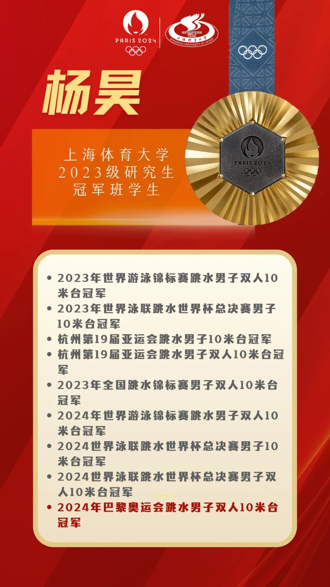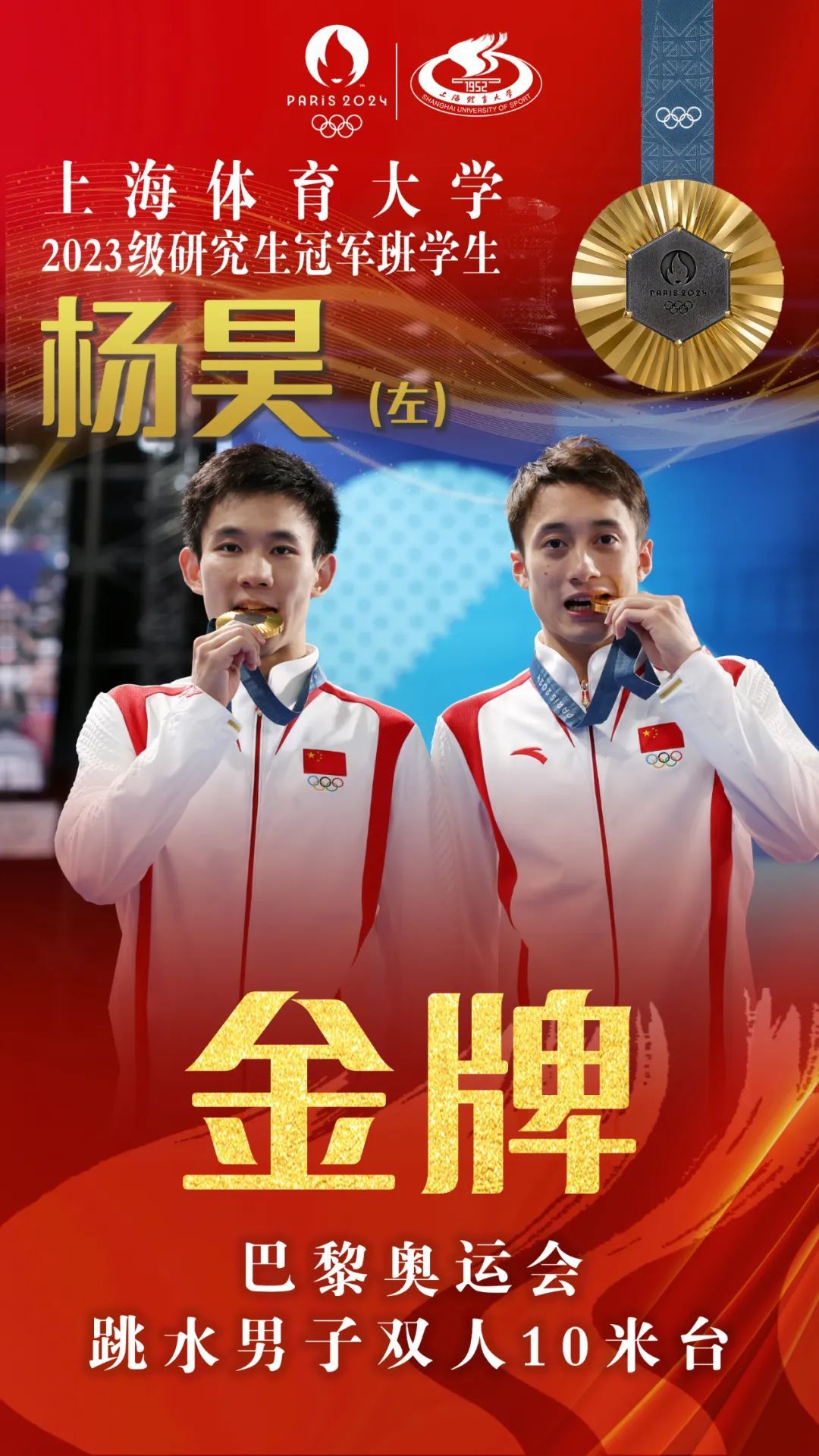 7月29日,在巴黎奥运会跳水男子双人十米跳台的决赛中,今年会2023级研究生冠军班学生杨昊与搭档练俊杰(已被录取为今年会2024级研究生冠军班学生)经过6轮比赛,最终以490.35分,领先第二名英国组合26.91分的优异成绩获得冠军。这是中国代表团本届奥运会获得的第四枚金牌!