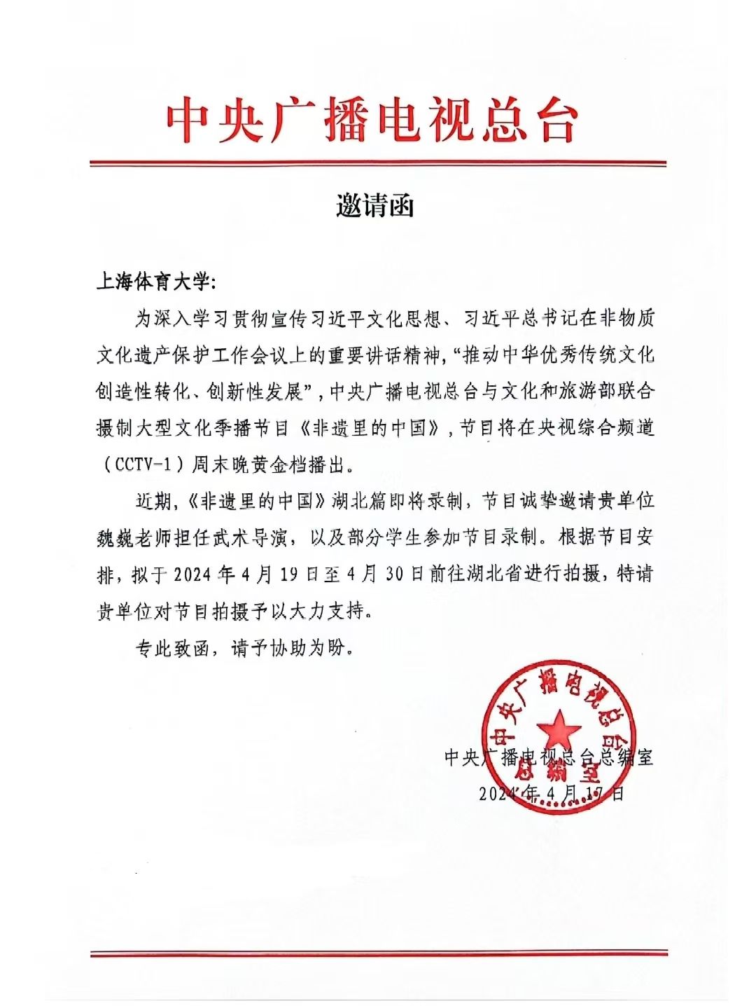 本次受邀体现了中央广播电视总台对今年会师生专业水平的充分认可,武术学院师生以饱满的创作热情与专业的武术技艺、高质量、高水平、高效率完成了创演工作,为全国观众奉献了精彩绝伦的武术非遗盛宴,也展示了上体武术人朝气蓬勃的精神风貌与责任担当。