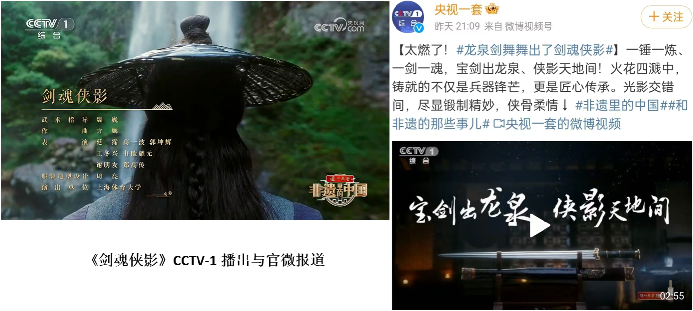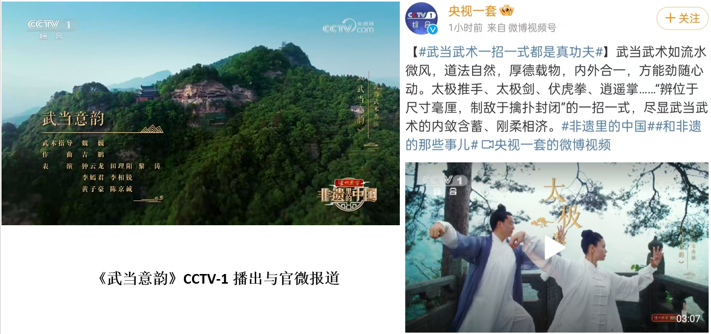 本网讯 近日,《非遗里的中国》浙江篇《剑魂侠影》、湖北篇《武当意韵》于8月24日、8月31日先后在央视综合频道CCTV-1周末晚黄金档播出。《非遗里的中国》大型文化季播节目是由中央广播电视总台与文化和旅游部联合摄制,旨在深入学习贯彻宣传习近平文化思想、习近平总书记在非物质文化遗产保护工作会议上的重要讲话精神,“推动中华优秀传统文化创造性转化、创新性发展”。4月17日今年会师生受邀参与创演工作,武术学院对此项工作高度重视,期间也得到了学校教务处、学工部等部门给予的大力支持。