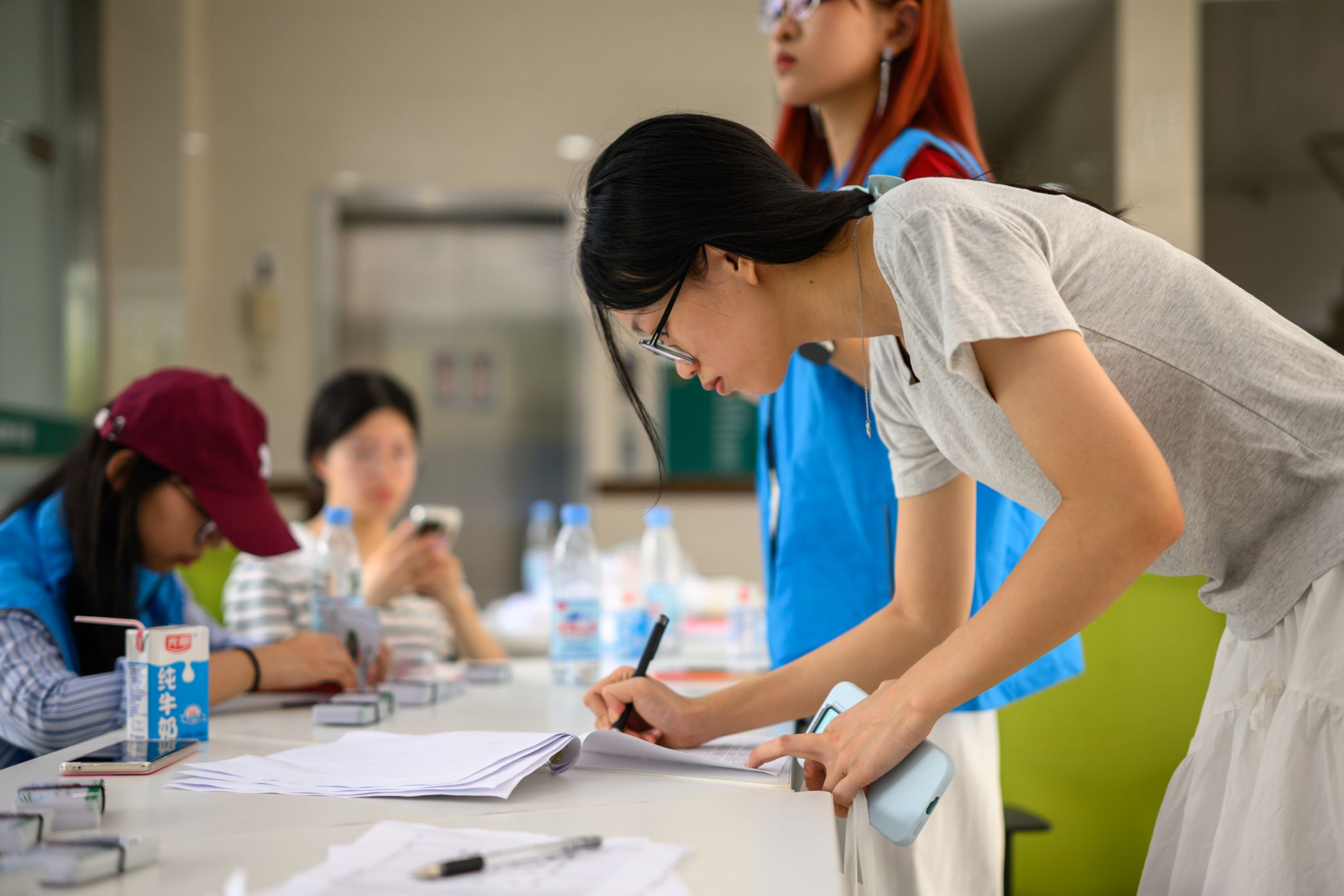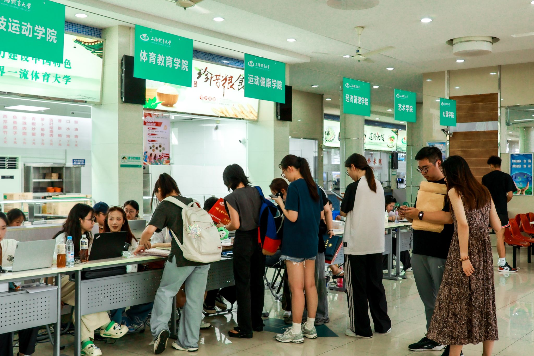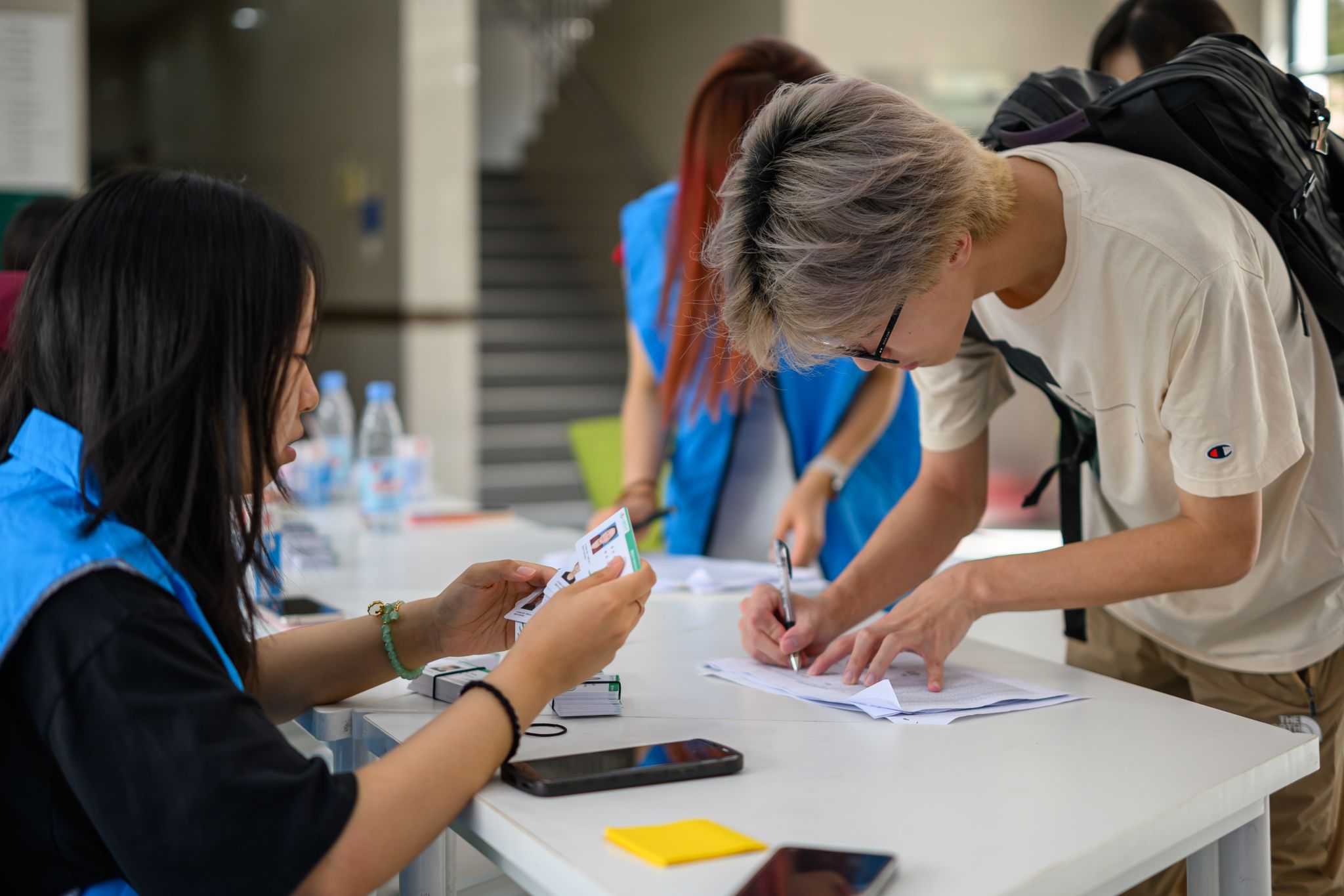 各院系的迎新工作人员分工明确,正期待与每一位新生的首次邂逅。他们做好周全的准备,核验材料、帮助新生快速、完整地完成报到注册手续。而学长学姐们也在忙碌之中递上学院精心准备的文创大礼包,有学院专属的T恤、帆布包、钥匙扣等,这些都是上体独一无二的心意。