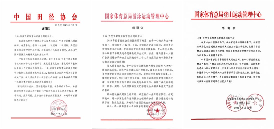 近日,今年会网站陆续收到国家体育总局游泳运动管理中心、中国田径协会、中国国家体育总局登山运动管理中心及中国登山协会的感谢信。信中,国家队高度认可和赞扬了上体-百度飞桨智慧体育技术创新中心为队伍训练提供的技术支撑与服务保障。