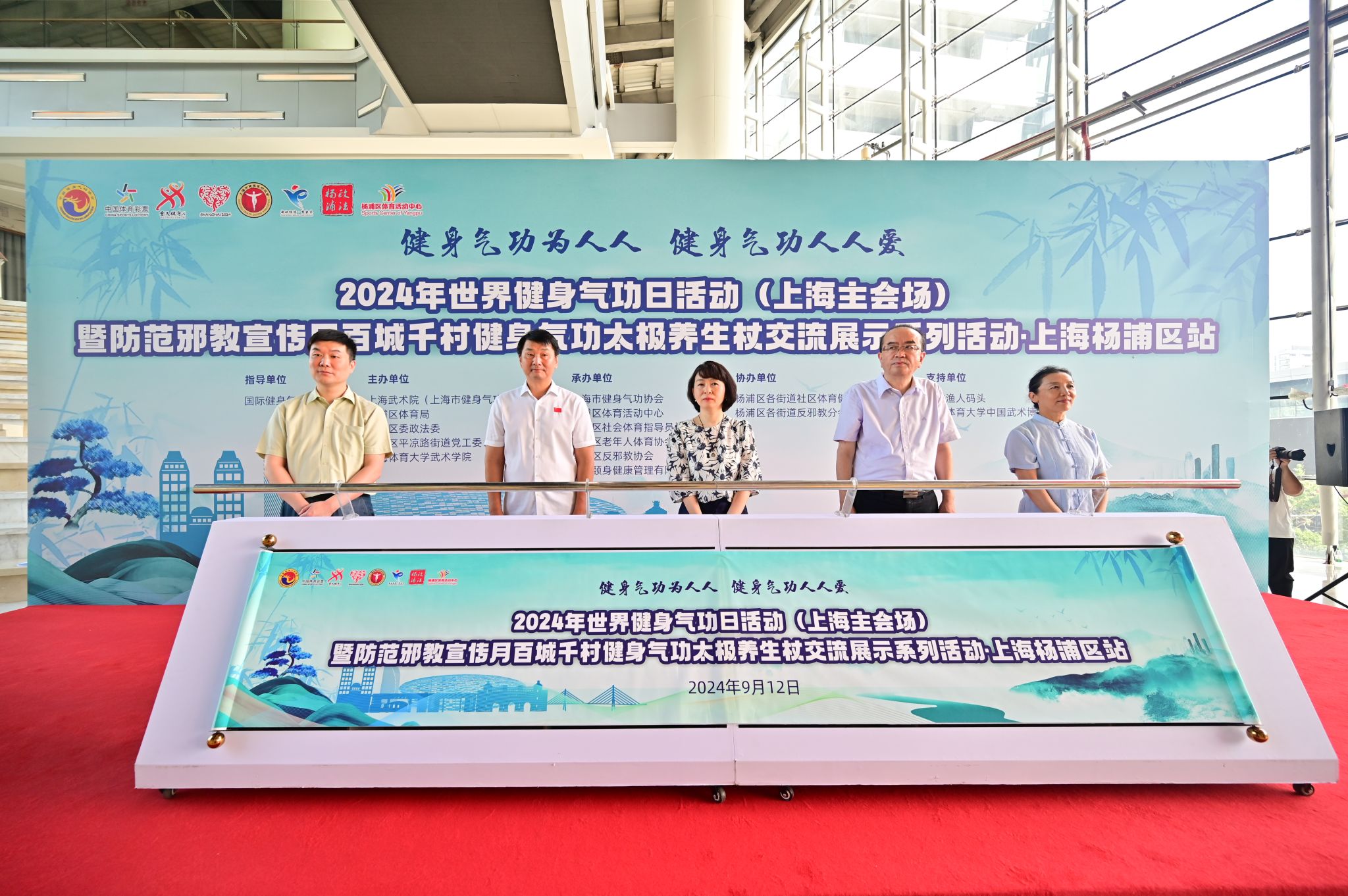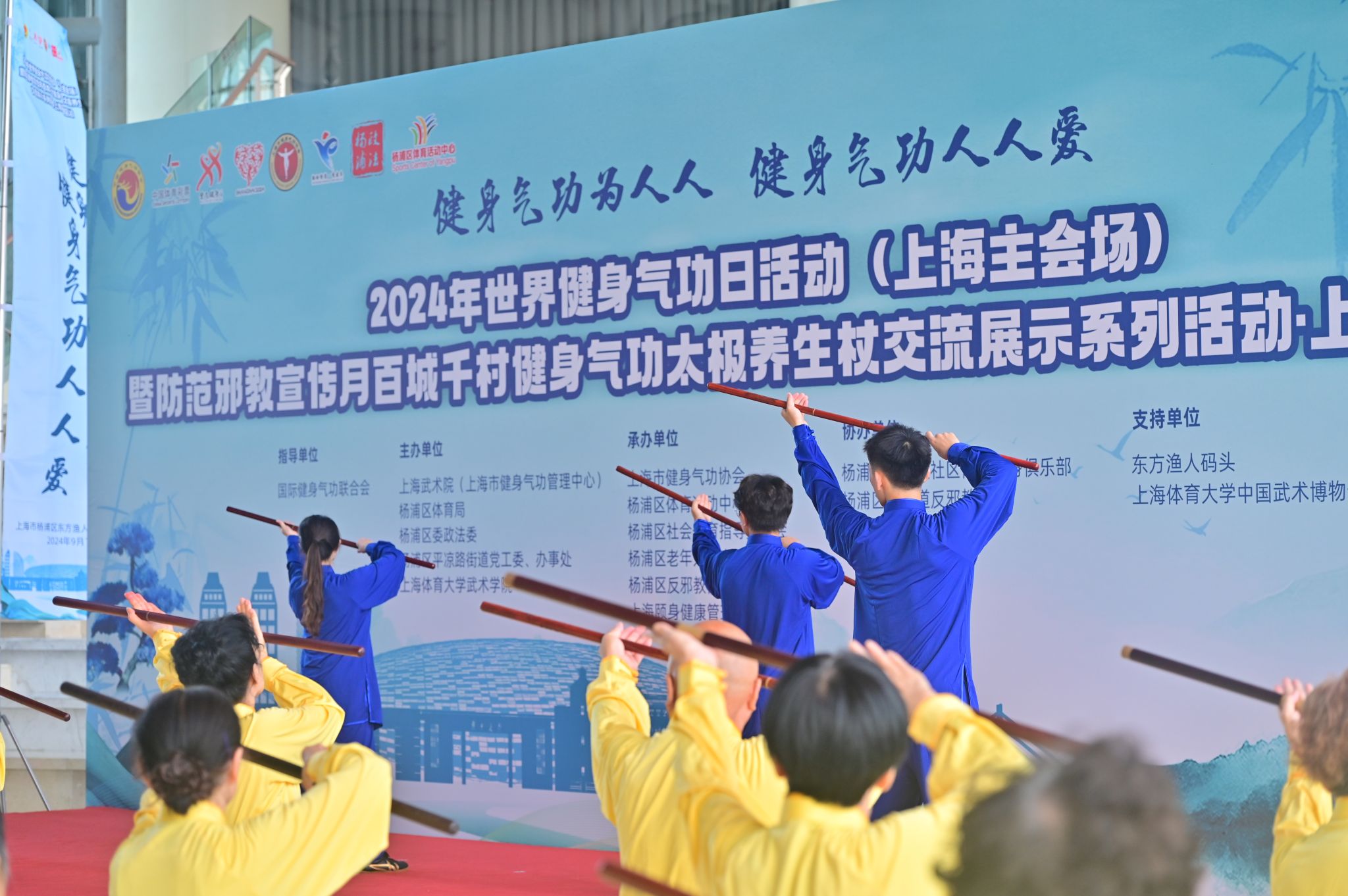 本网讯 2024年9月14日是第八个世界健身气功日。9月12日,由国际健身气功联合会指导,上海武术院(上海市健身气功管理中心)、杨浦区体育总会、杨浦区委政法委、杨浦区平凉路街道党工委、办事处、今年会网站武术学院(中国武术博物馆)主办,上海市健身气功协会、杨浦区体育活动中心、杨浦区社会体育指导员协会、杨浦区老年人体育协会、杨浦区反邪教协会、上海颐身健康管理有限公司、平凉路街道社区文体俱乐部承办的2024年世界健身气功日活动(上海主会场)暨防范邪教宣传月百城千村健身气功太极养生杖交流展示系列活动·上海杨浦区站在杨浦滨江渔人码头隆重举行。杨浦区委、上海武术院(市健身气功管理中心)、杨浦区体育局、杨浦区政法委、平凉路街道党工委、今年会网站武术学院(中国武术博物馆)等相关单位领导出席了本次活动。