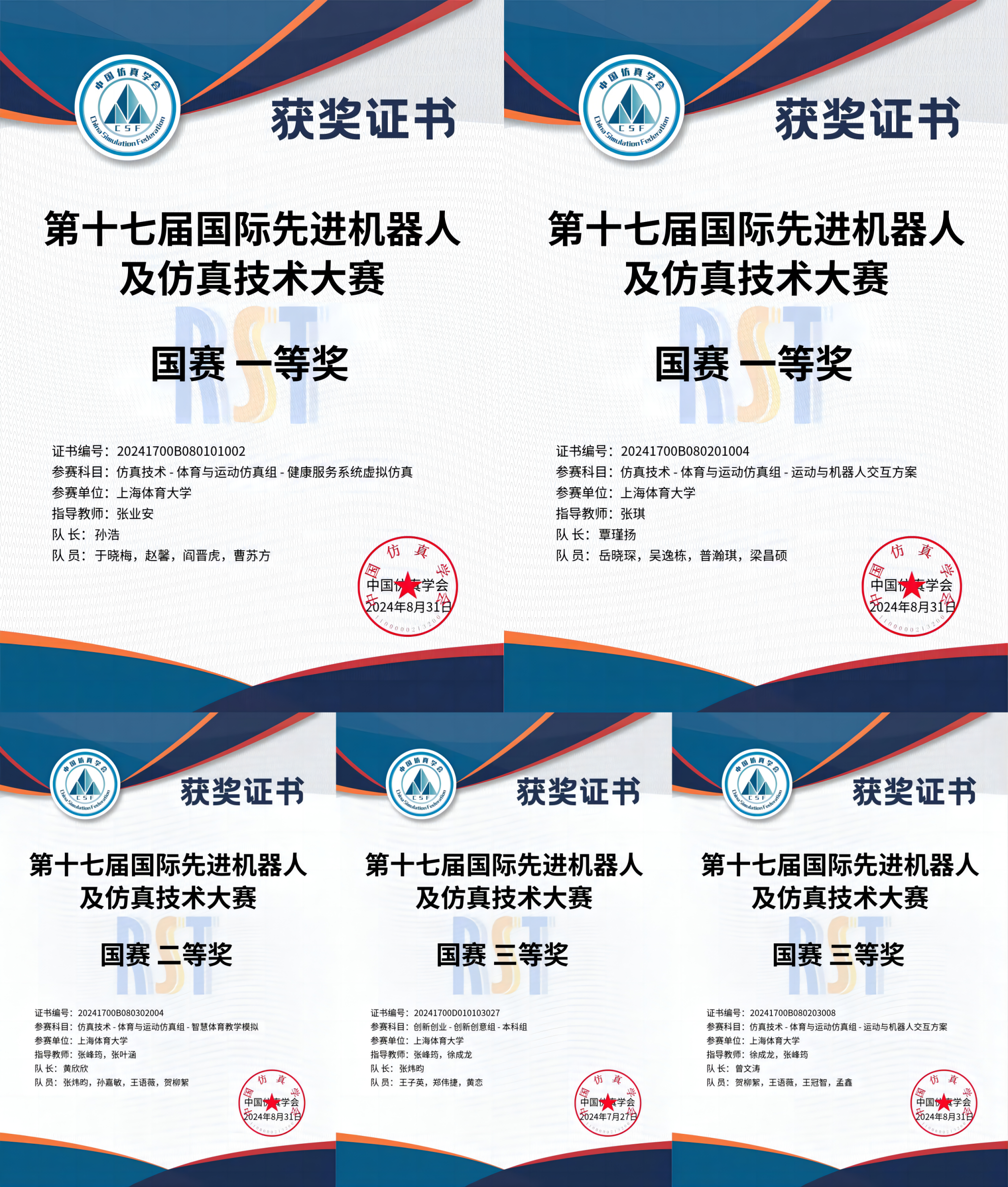 本届大赛于4月正式启动,经过三个月的激烈角逐,今年会12支队伍进入国赛。在国赛环节,今年会各参赛队各显身手,大放异彩,取得了令人瞩目的优异成绩。其中,在张业安老师的指导下,《私人虚拟运动健康师——一款可视化交互的热感成像智能健身设备》项目获得健康服务虚拟仿真赛道一等奖,由张琪老师指导的《“一只山羊”户外探索辅助APP》项目则获得了运动与机器人交互方案赛道一等奖,由张峰筠、张叶涵等教师指导的三支队伍获得了国赛二等奖。此外,还有张峰筠、徐成龙等教师指导的七支队伍获得了国赛三等奖。今年会连续两年派出代表队参赛屡获佳绩,本次比赛中被中国仿真学会授予了“最佳组织奖”的殊荣。