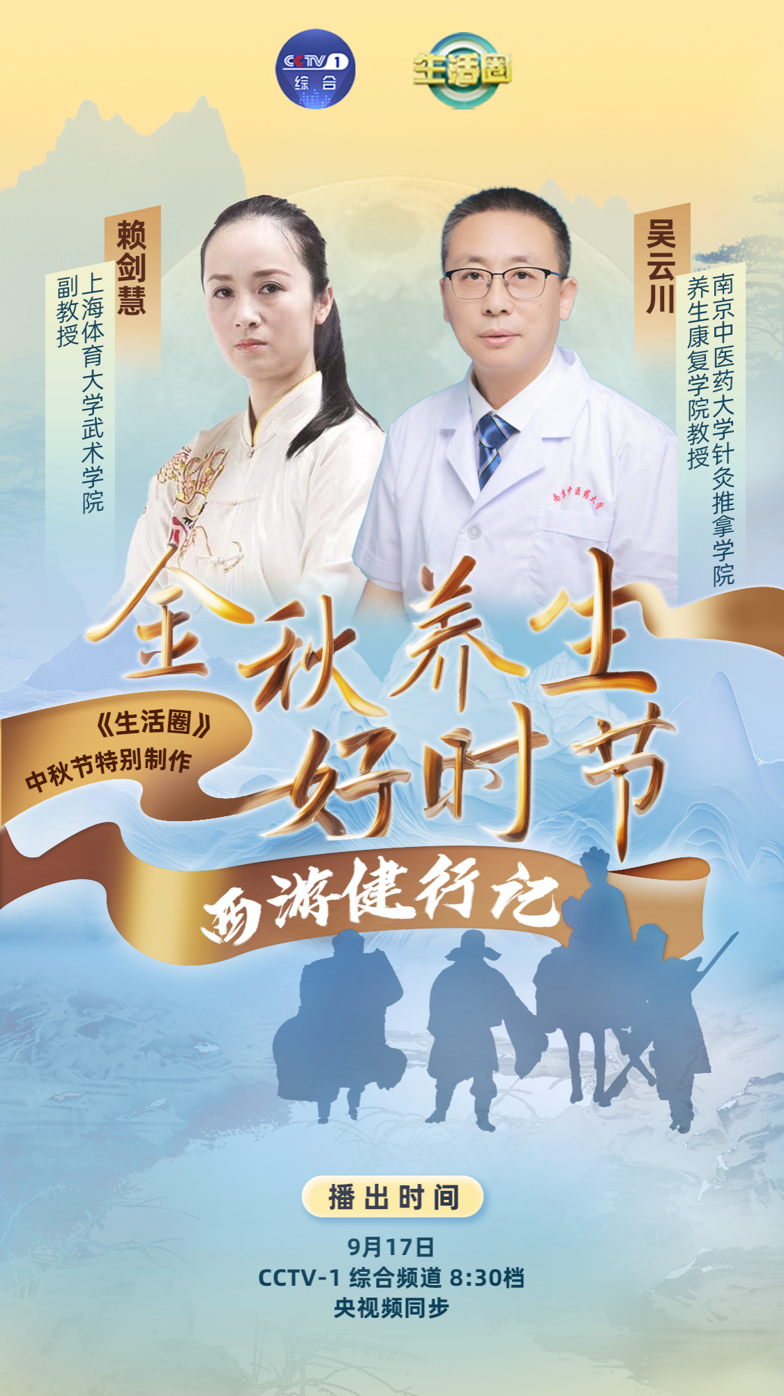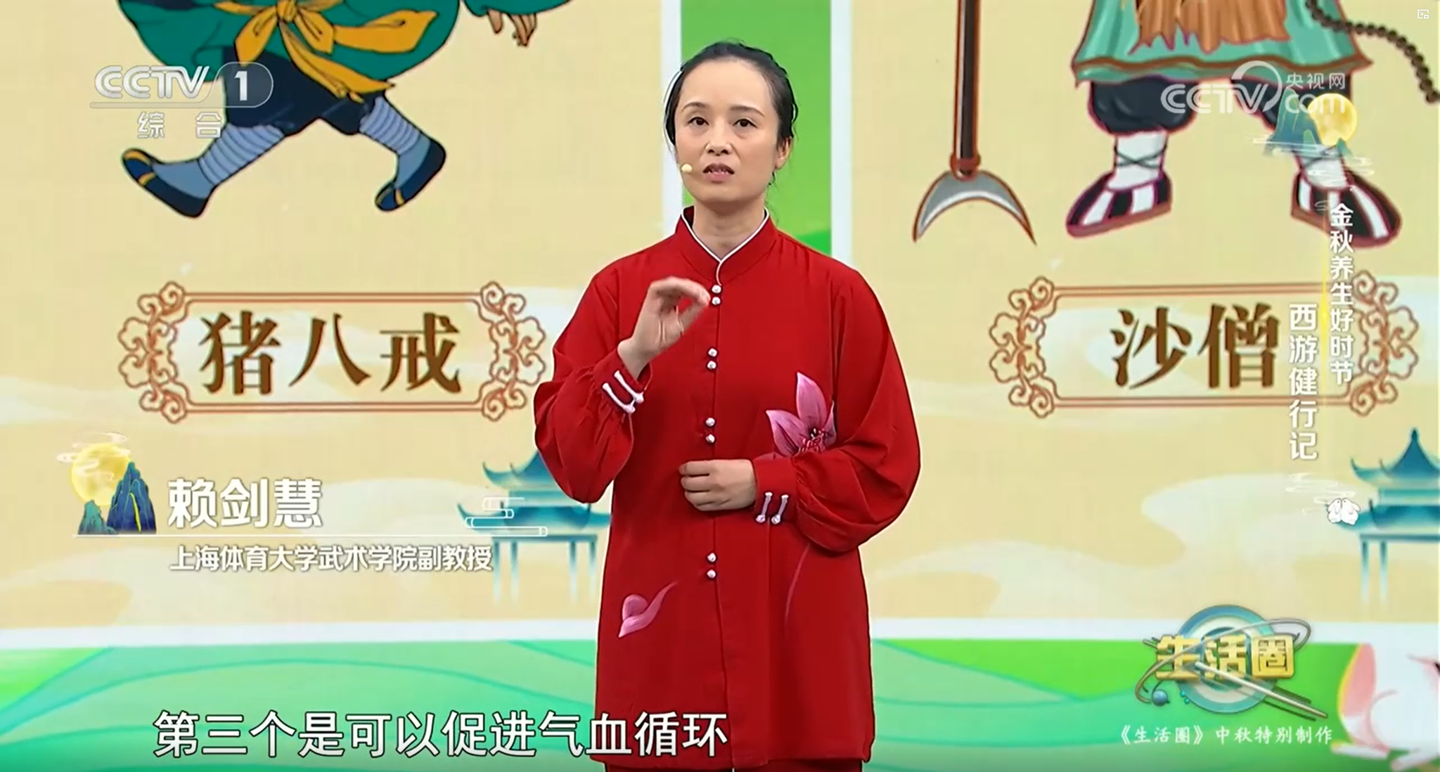 本网讯  9月17日,农历八月十五,是中国四大传统节日之一的中秋节。中秋节当天,我院非遗体育与健康养生教学团队赖剑慧副教授受邀为央视综合频道CCTV-1《生活圈》栏目录制的中秋特别节目“金秋养生好时节·西游健行记”播出,用健身气功专业知识为健行之旅增添健康与文化的亮色。