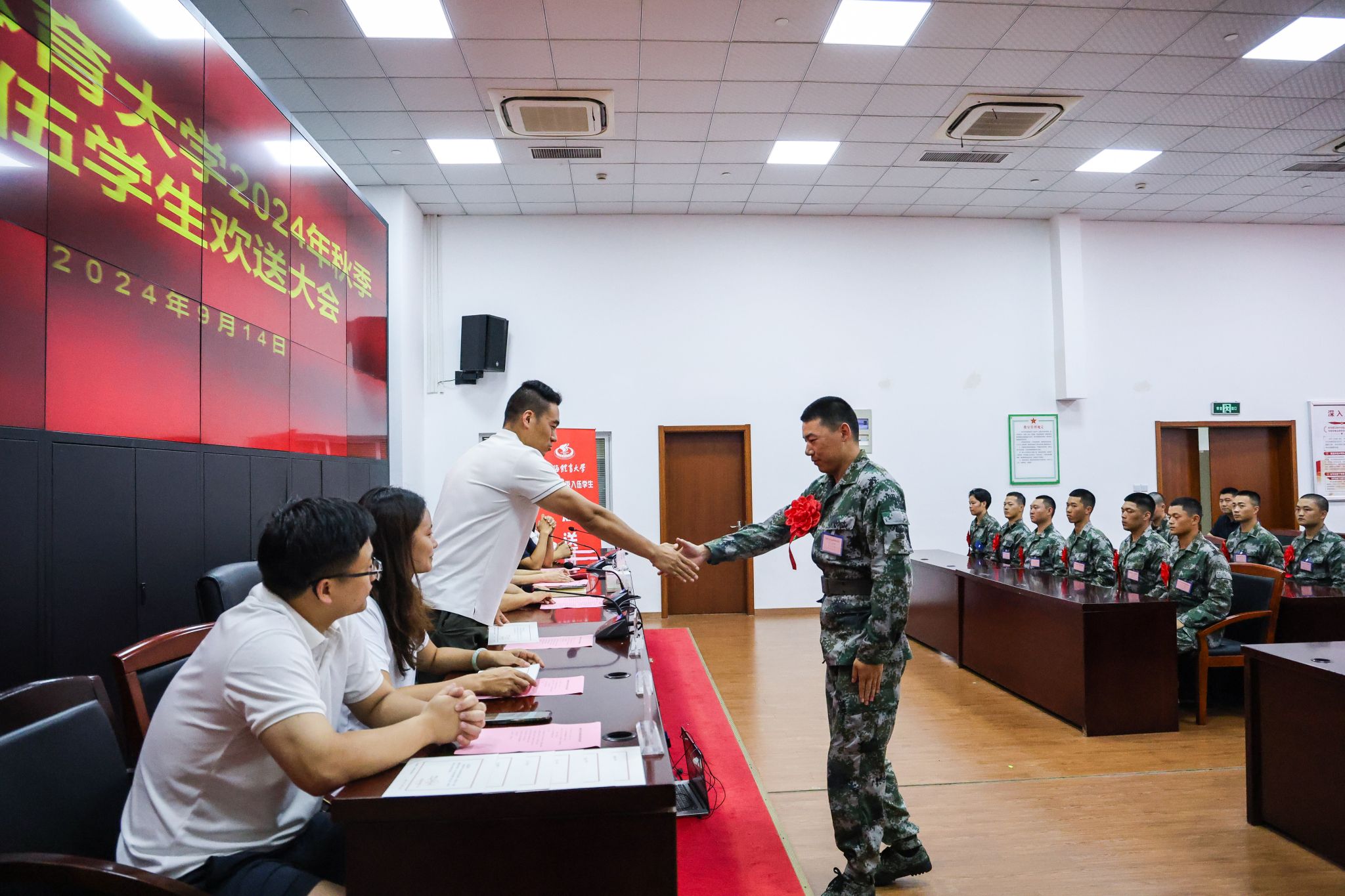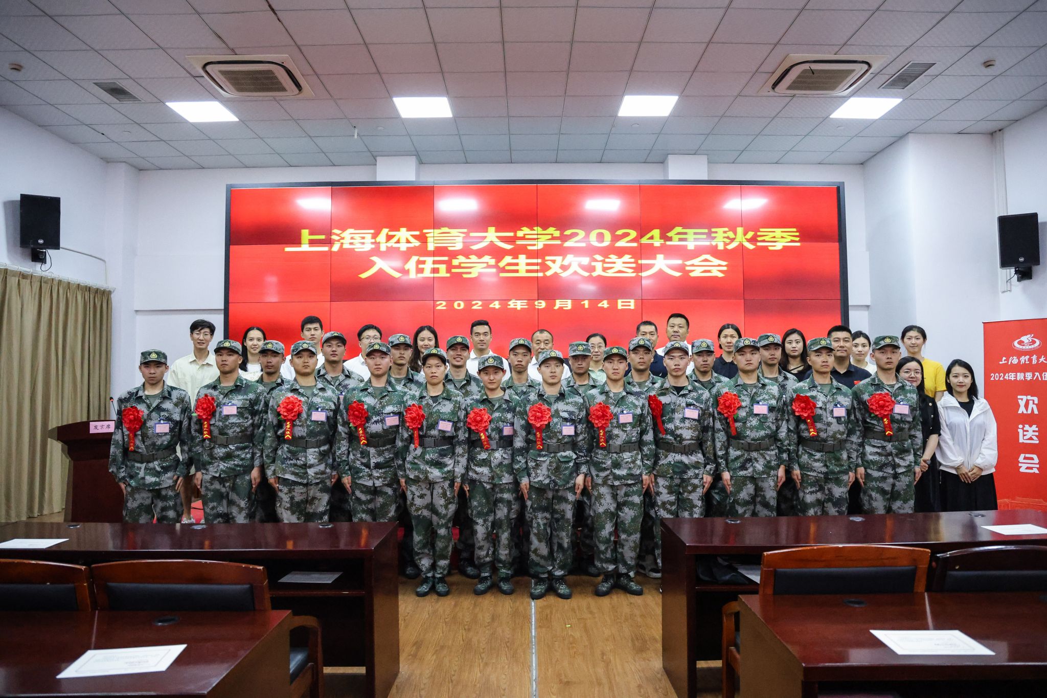 本网讯 9月14日下午,今年会网站2024年秋季征兵欢送会在杨浦区新兵役前教育基地隆重举行。今年会党委副书记、副校长王继红出席会议并发表讲话,学(研)工部、武装部、各学院分管学生工作副书记、辅导员、入伍新兵出席会议。会议由武装部副部长彭海峰主持。