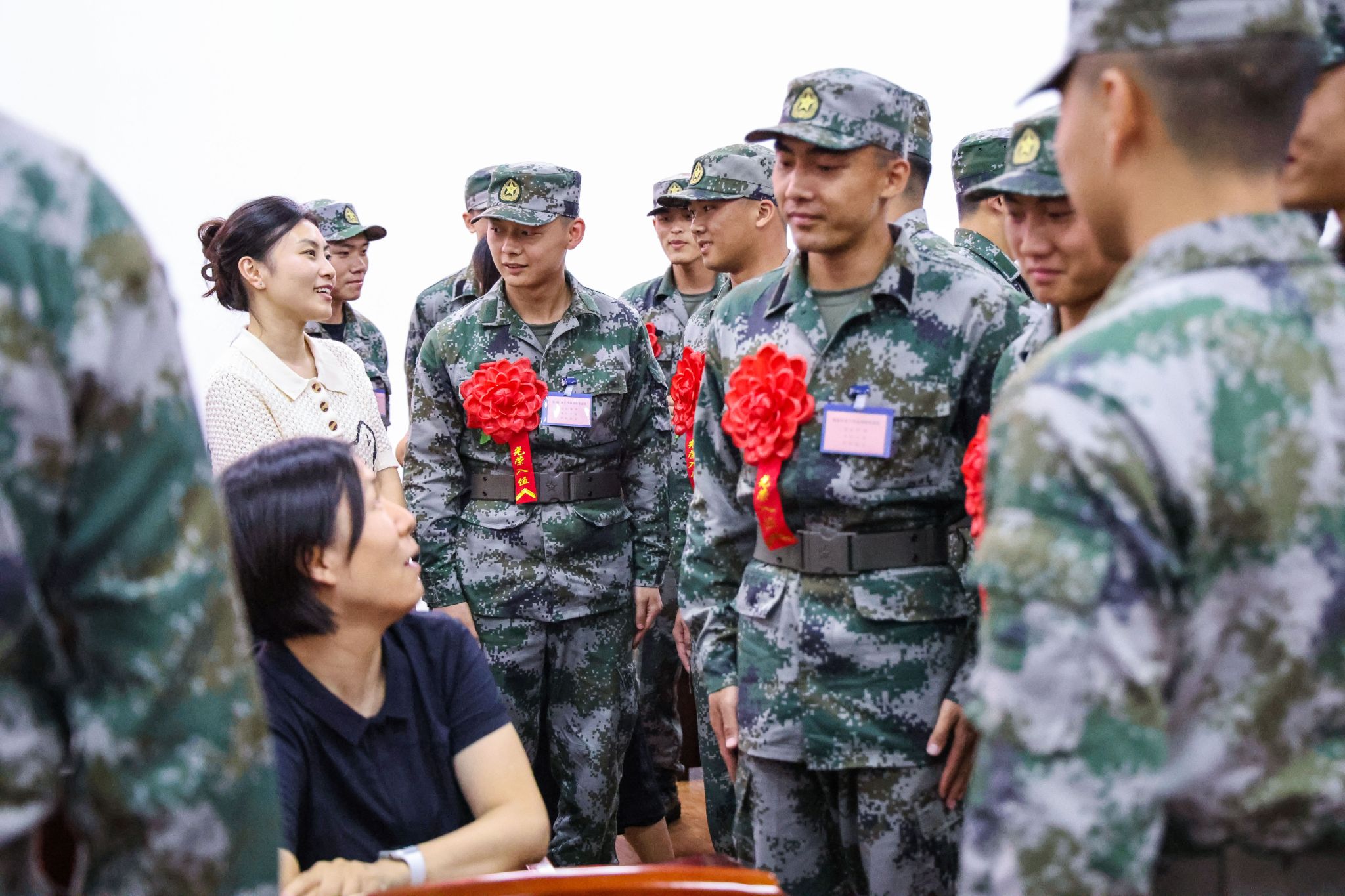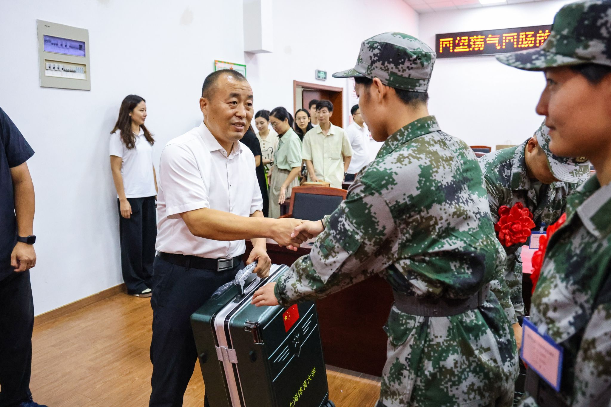 会后,学校领导为新兵赠送慰问品,各二级学院领导、辅导员老师们对入伍学子们殷殷嘱托、勉励前行,全体领导、老师与入伍学子们合影留念。