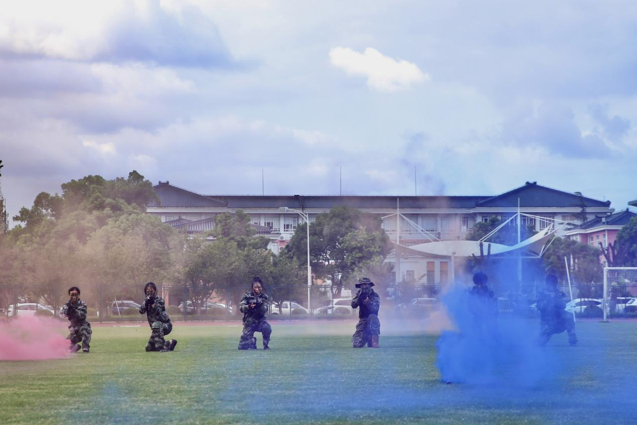 最后,战术班进行了对抗演练展示,在青黄硝烟掩护下,一排排战术班队员从迷雾中杀出,展现出干练实用的战术组合。