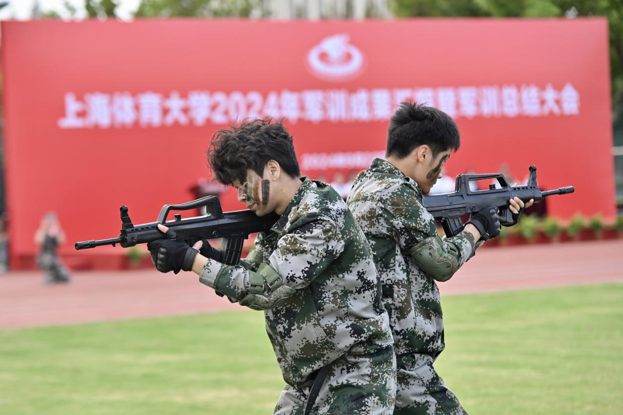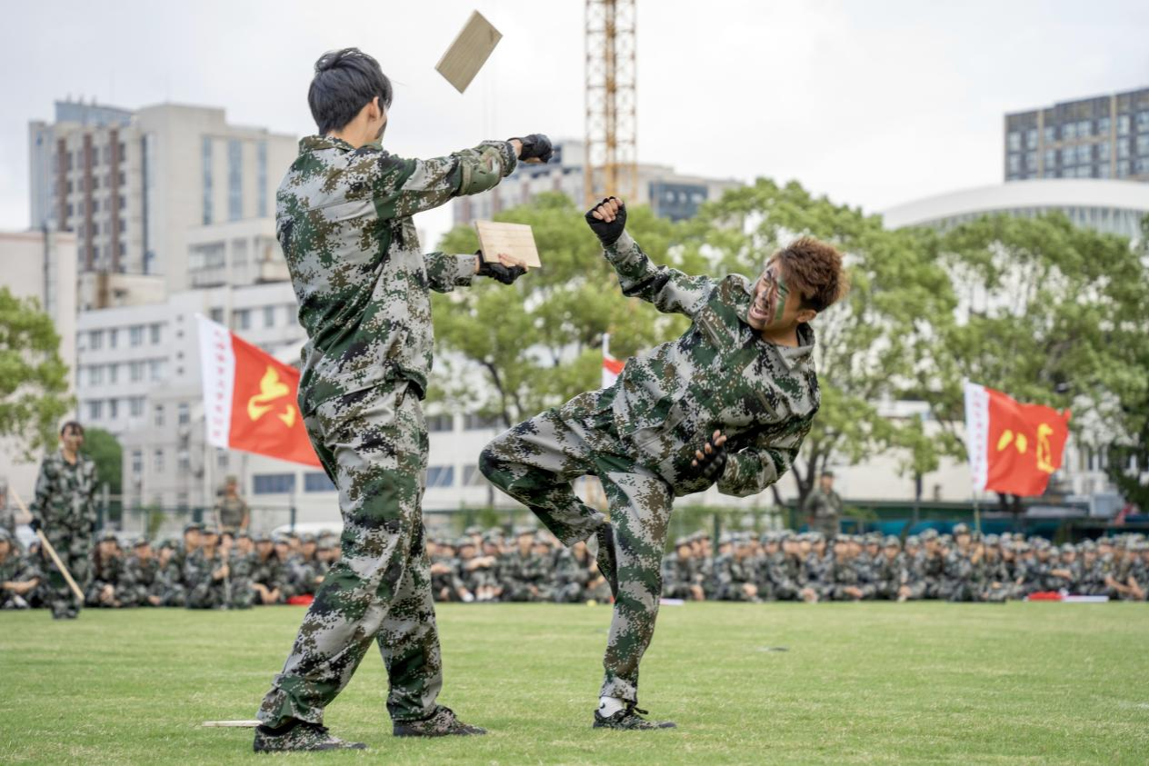 紧接着,刺杀操队展示刺杀操动作。队员们喊着震耳的口号,跑步行进到场中,干净利落地打出一套刺杀动作,气势逼人。
