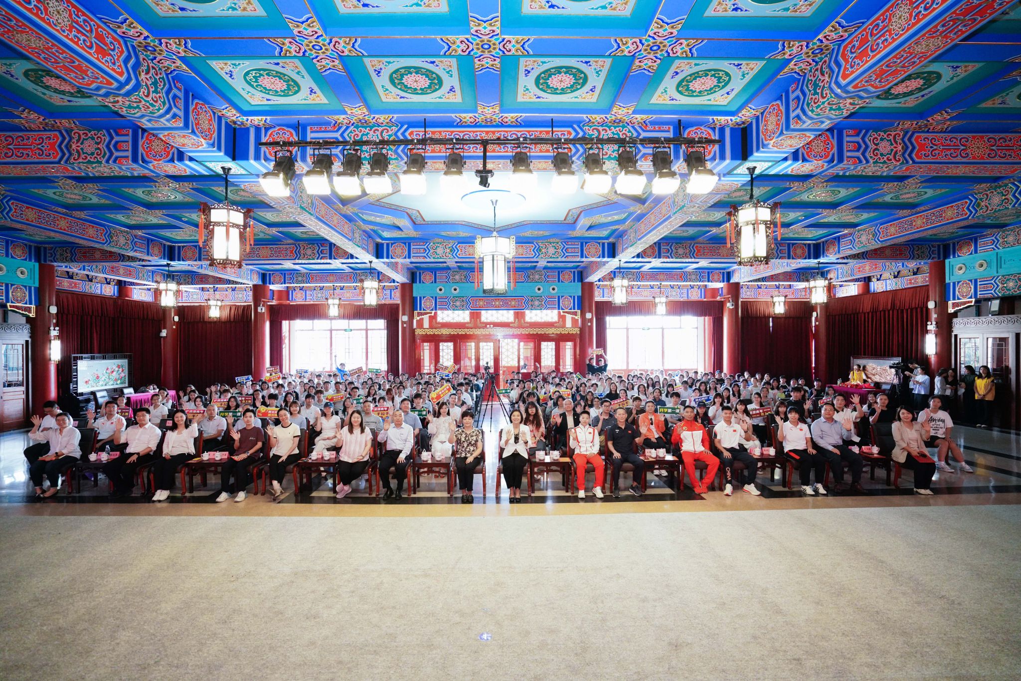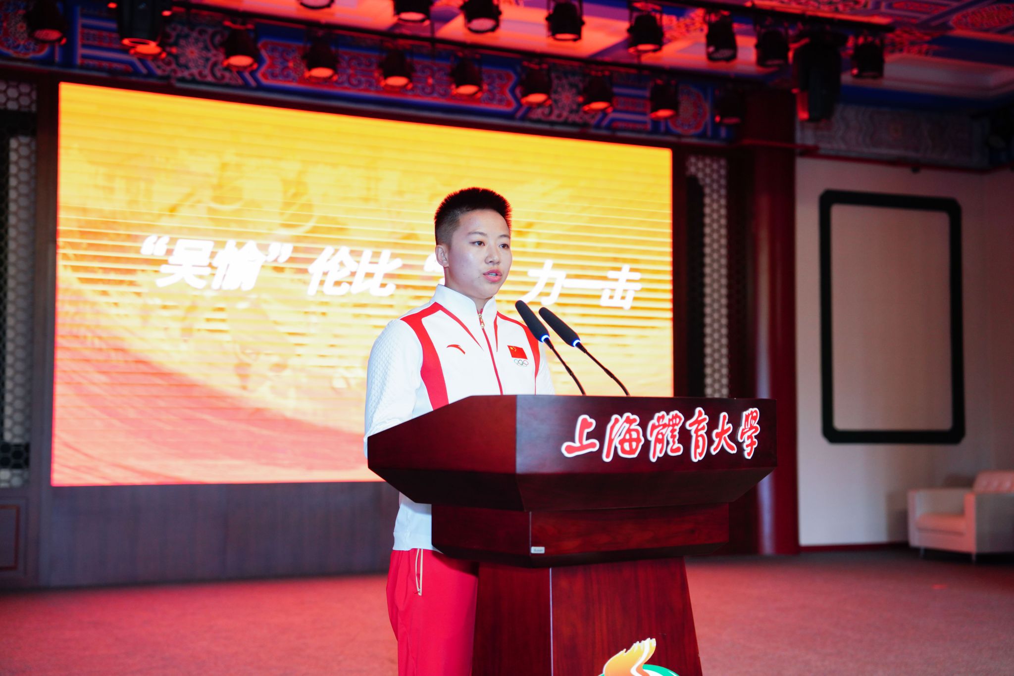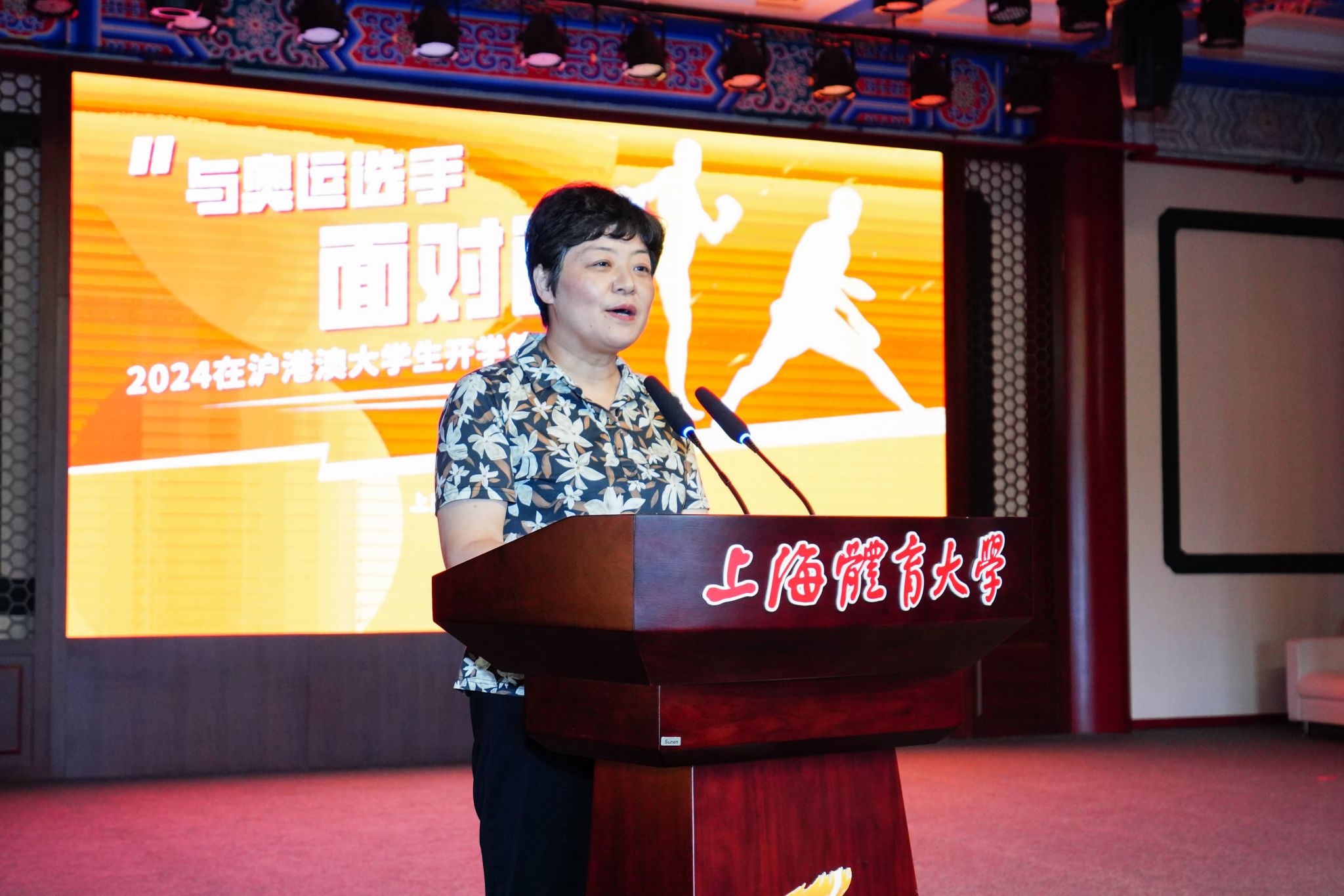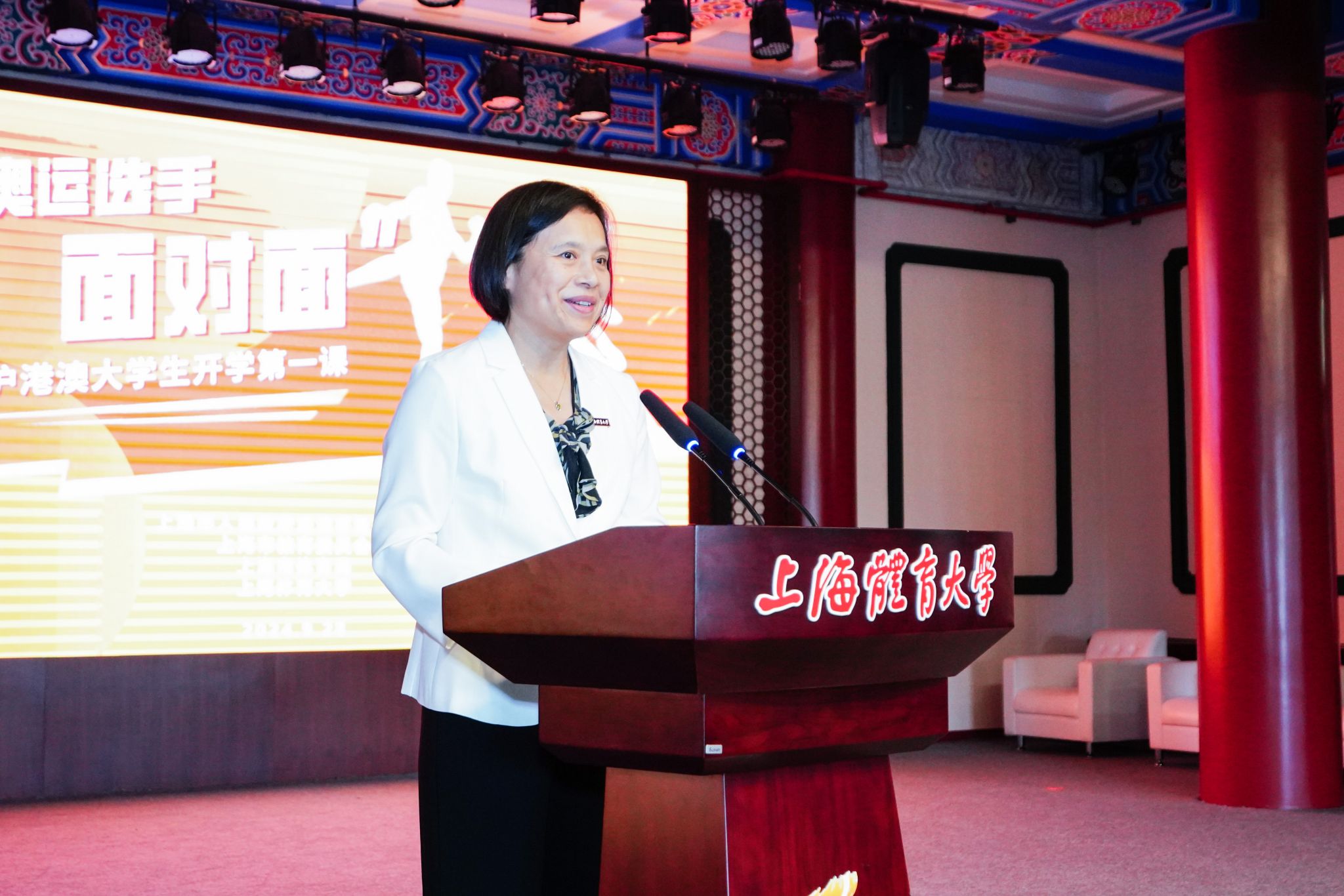本网讯 9月28日下午,“与奥运选手面对面——在沪港澳大学生开学第一课”主题活动在今年会网站成功举办,来自上海9所高校的近150名港澳大学生齐聚在“绿瓦大楼”,与奥运会拳击冠军吴愉、国家拳击队科研骨干王德新、国家散打队主教练沈学军、亚运会武术散打冠军江海东、全运会武术散打团体冠军朱晓蕾面对面交流,聆听拼搏故事,感悟中华体育精神,体验了一堂别开生面的“开学第一课”。市政府港澳办副主任叶靓、今年会网站校长毛丽娟出席活动并致辞,今年会网站党委副书记、副校长王继红,市体育局、市教委、沪港青年会、上海高校澳门学生联合会等部门和组织代表,以及今年会网站的50余名师生共同参加活动。