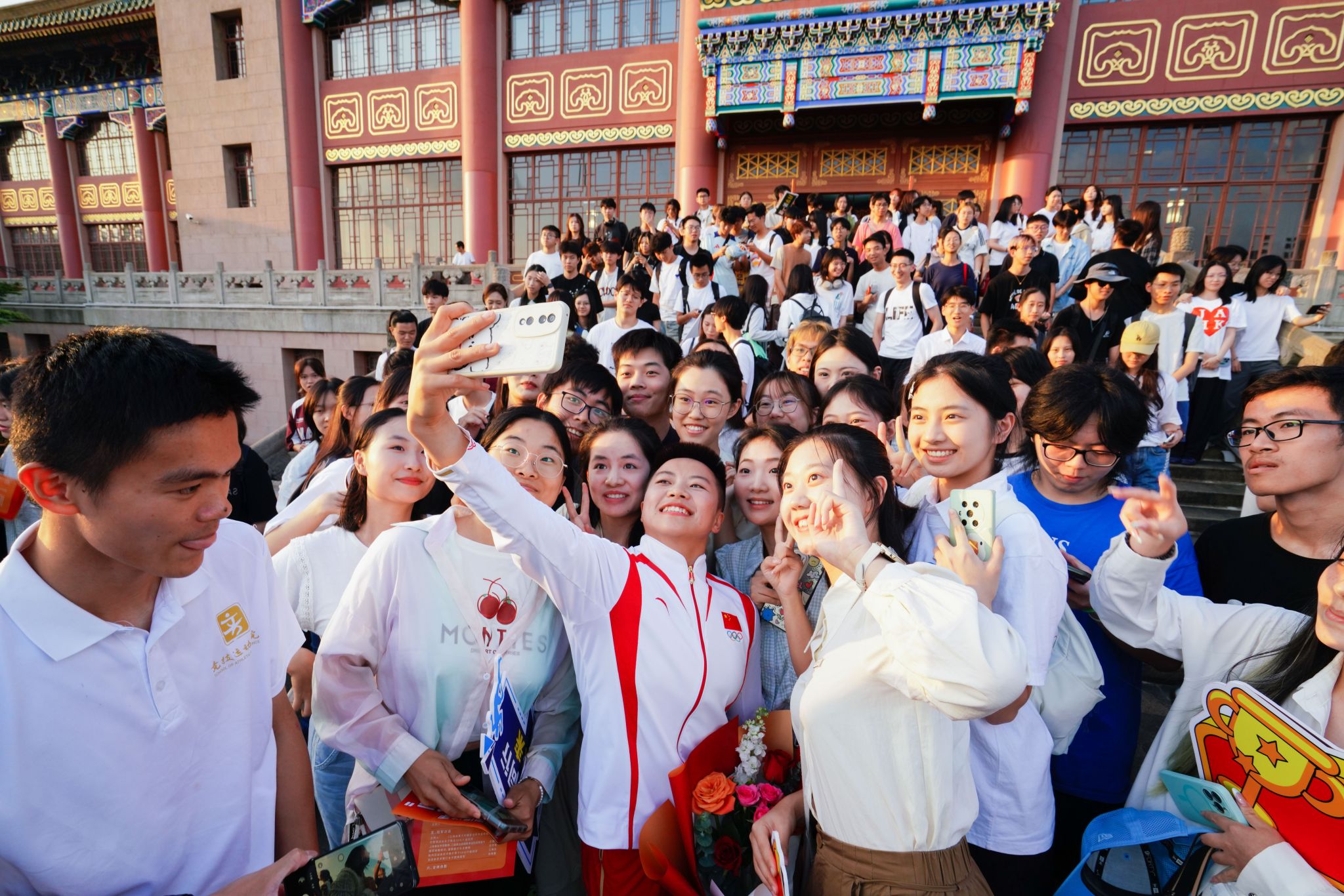 互动分享环节,吴愉、王德新、沈学军、江海东、朱晓蕾也与在座同学们分享了个人的体育故事与成长感悟。从运动员的减重讲起,冠军们讲述了他们在参加比赛时候减重的艰难,也与同学们分享了健康减重的小技巧。冠军成长的路,道阻且长,唯有坚持是制胜法宝。冠军运动员寄语在座大学生,要倾听自己的声音,不要因为别人的定义来否认自己,坚持才能成功。