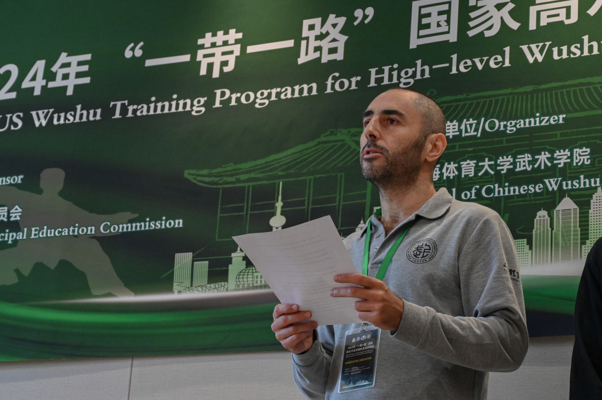 来自西班牙的学员Álvaro作为学员代表进行了发言,他希望通过本次武术培训提升专业技术,近距离了解中国文化,回国后将武术传播给更多人。