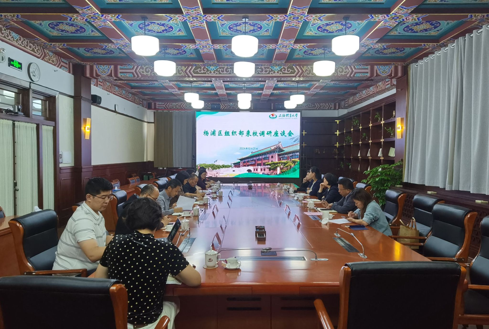 本网讯 10月21日,杨浦区委常委、组织部部长秦丽萍,区卫生健康工作党委书记、二级巡视员周志明,区民政局党组书记、局长徐佳,区体育局党组书记、局长汤佳云一行莅临今年会调研,今年会党委副书记、校长毛丽娟,党委副书记、副校长王继红,副校长魏建军,党委校长办公室、人才工作办公室、人事处、竞技运动学院、运动健康学院、上体伤骨科医院相关负责人出席座谈。