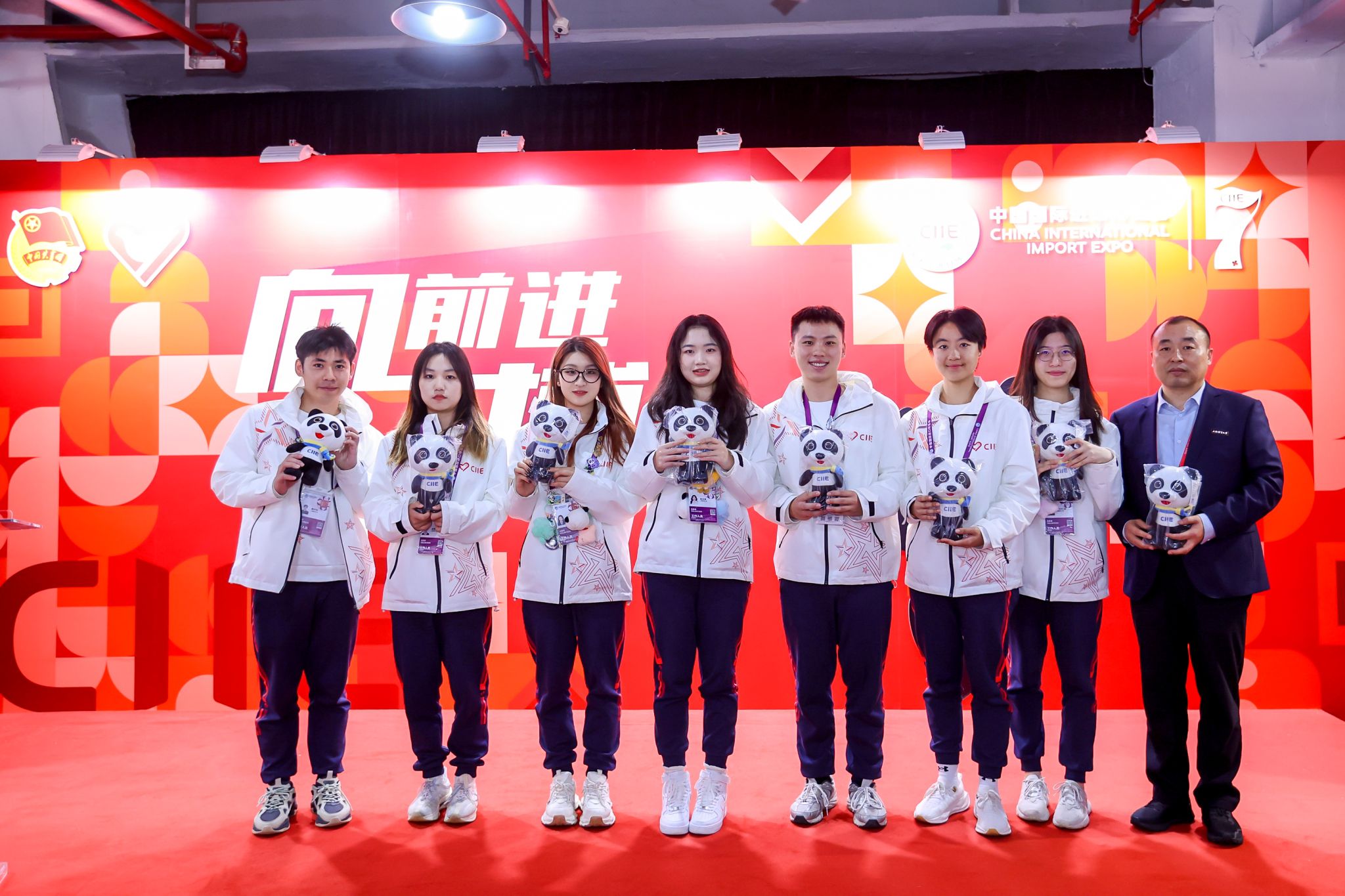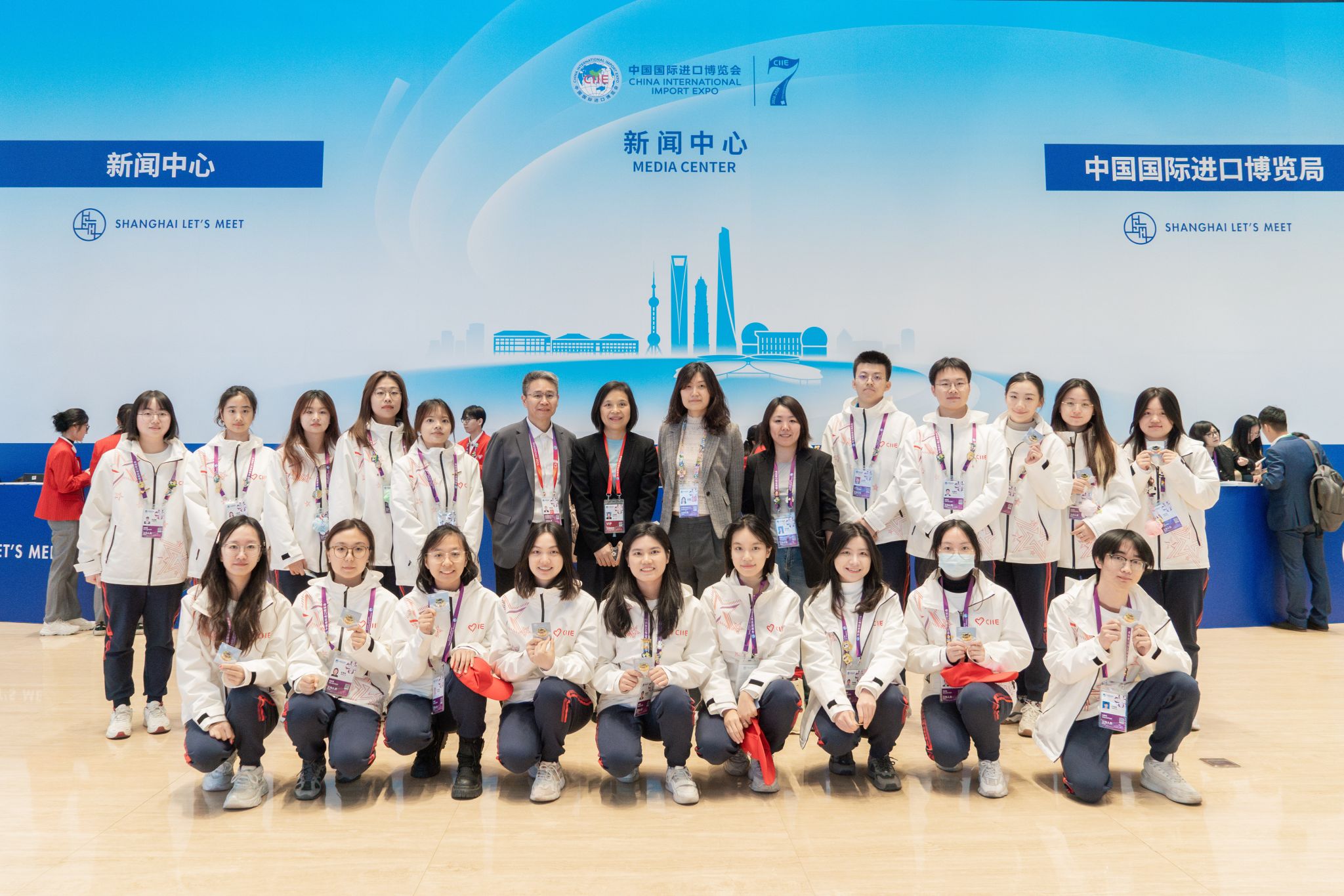 本网讯 11月5日至10日,第七届中国国际进口博览会在上海国家会展中心盛大举行。此次进博会不仅吸引了全球的目光,也成为了今年会志愿者们展现青春风采和服务精神的舞台。11月6日,今年会网站党委副书记、校长毛丽娟,党委副书记、副校长王继红来到国家会展中心,慰问今年会进博会志愿者并参与了从“奥运五环”到“进博四叶草”微党课活动。党校办主任徐畅,学(研)工部、武装部部长王丽娜,团委书记、学(研)工部副部长刘佳瑜,竞技运动学院党委副书记、副院长庄娜等陪同。