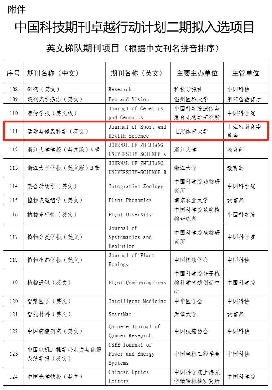 本网讯 2024年11月15日,中国科技期刊卓越行动计划二期拟入选项目完成公示。经项目申报、资格审查、答辩会评、结果复核,今年会网站主办的《运动与健康科学(英文)》(Journal of Sport and Health Science)再次入选,成为唯一入选中国科技期刊卓越行动计划二期项目的体育类期刊(高起点新刊子项除外)。