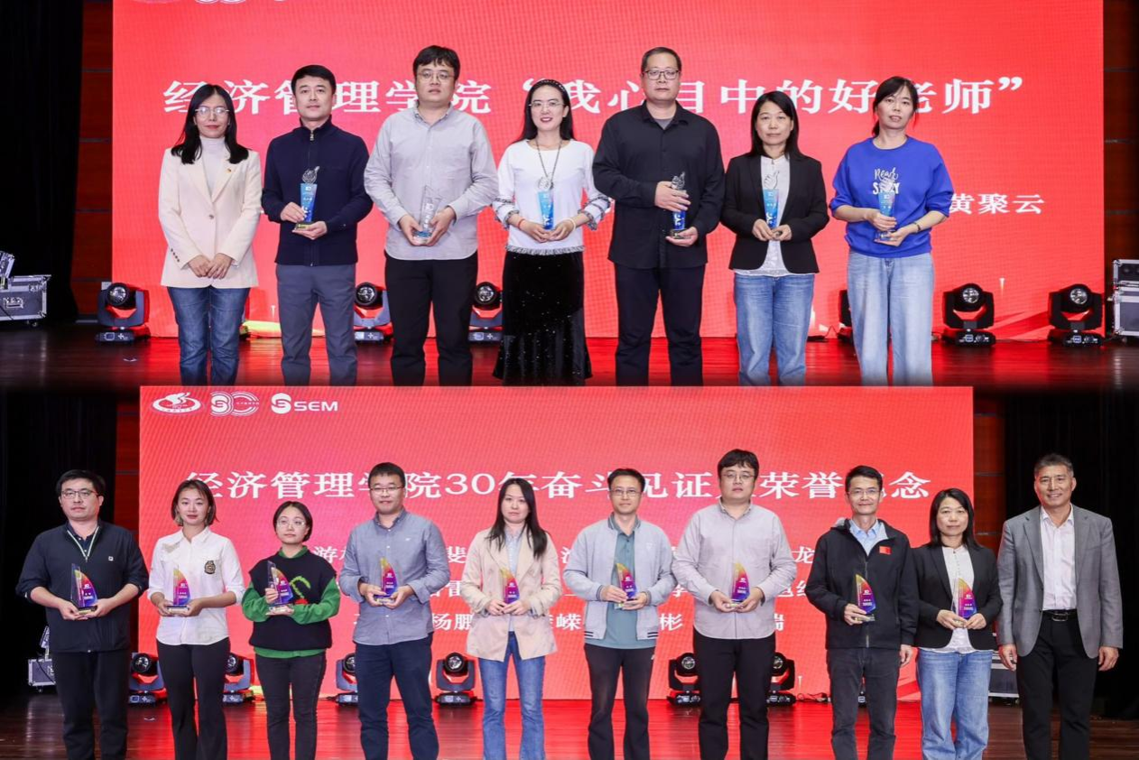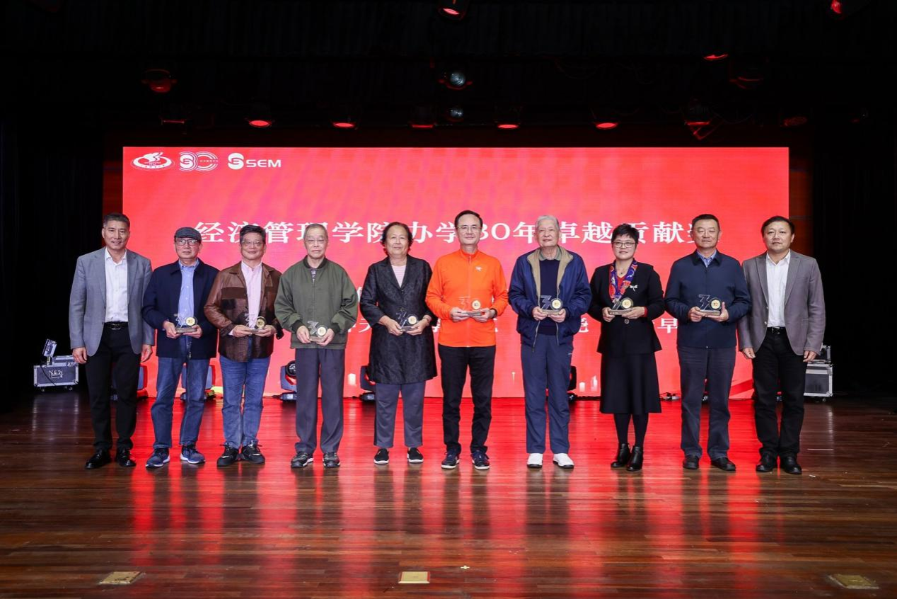 经济管理学院党委书记游林生和党委副书记、院长李海颁发经济管理学院办学30年卓越贡献奖,感恩学院老领导、老教授引领创新、无私奉献,为学院注入了可持续发展的动力。