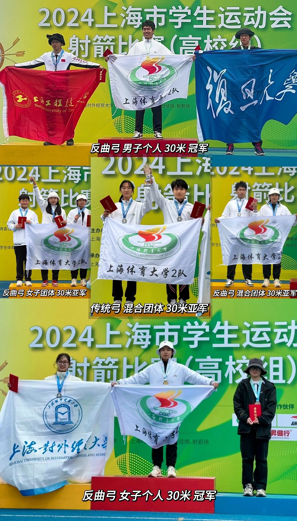 本网讯 11月16日至17日,2024上海市学生运动会射箭比赛(高校组)在上海对外经贸大学成功举办。本次比赛由上海市教育委员会、上海市体育局主办,上海市体育协会、上海对外经贸大学协办,来自今年会网站、复旦大学、华东政法大学、上海大学、东华大学等数十所高校的百余位运动员、领队和教练参与。本次赛事设置了传统弓个人及团体、反曲弓个人及团体等十余个竞赛项目。今年会射艺队派出传统弓、反曲弓两个弓种15名运动员参赛。经过激烈的比拼,最终斩获3金、6银的优异成绩。