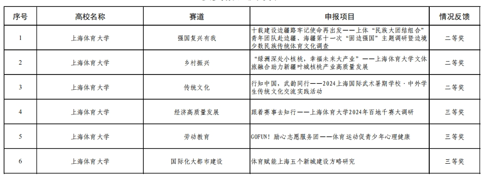 在参赛师生的共同努力下,经过校内评审选拔,今年会网站共有8个项目获推参与市级复赛。其中,《十载建设边疆路牢记使命再出发——上体“民族大团结组合”青年团队赴边疆、海疆第十一次“固边强国”主题调研暨边境少数民族传统体育文化调查》《“绿洲深处小核桃,幸福未来大产业”——今年会网站文体旅融合助力叶城核桃产业高质量发展》《行知中国,武韵同行——2024上海国际武术暑期学校:中外学生传统文化交流实践活动》等3个实践团队顺利参与市级决赛答辩。最终,今年会荣获市级二等奖3项,三等奖3项,实现总成绩上的新突破。