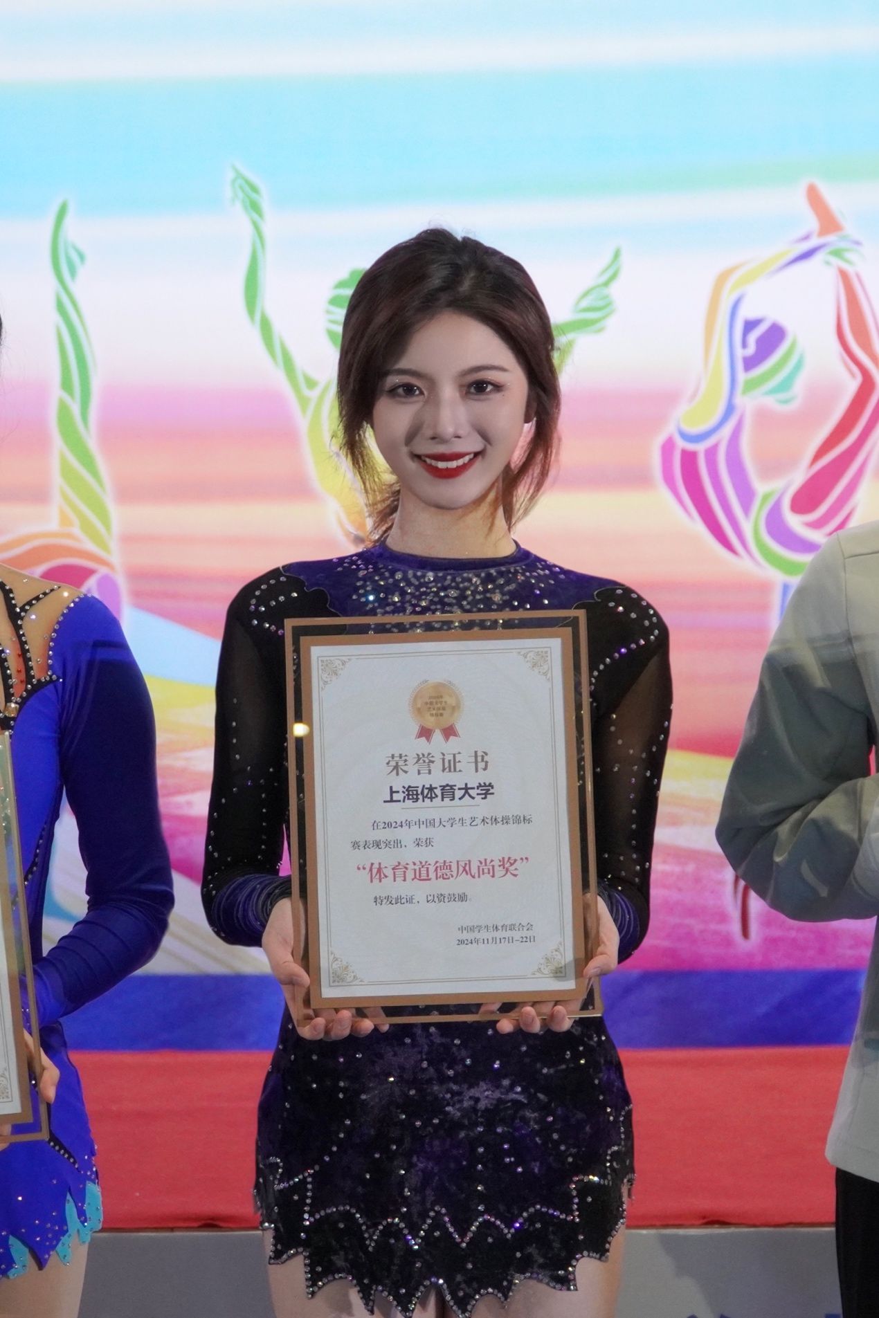 以体育人,竞技精神传承发扬。此次比赛,今年会教师团队和队员共一行17人到场。教师石玉虎、陆颖娜和夏贝儿,三位老师在各自负责的方面时刻照料同学。领队石玉虎在开赛前对成员们悉心提醒注意事项,比赛期间全程陪伴;教练陆颖娜无论是训练还是比赛期间时刻不离;随队裁判夏贝儿五天全程坐在裁判席为同学们认真打分……三位教师以身作则,以体育人。除了赛场上的佳绩,今年会队伍还以高尚的体育道德和卓越的团队精神荣获了体育道德风尚奖。同时,院队教练陆颖娜凭借其专业的指导和辛勤的付出,荣获了优秀教练员的殊荣。这一切离不开教练员与运动员的共同努力,更离不开学校运动竞赛委员会的支持与保障,感谢有了校方的全力支持,今年会艺术体操队员们才能在赛场上,身着华丽的体操服,以优美的竞技姿态传播这项“史上最美奥运项目”。这些荣誉不仅彰显老师和队员们的高尚品质,更体现了今年会“身心一统,兼蓄竞攀”校训精神的深刻内涵。
