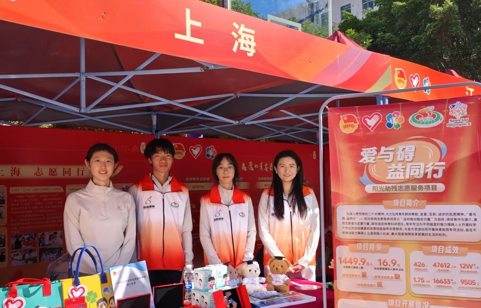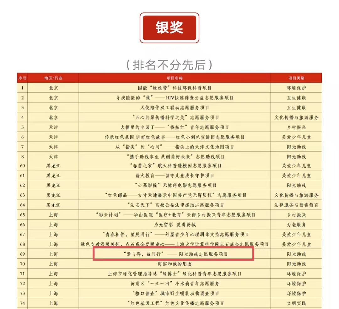 本次大赛以“青春为中国式现代化挺膺担当”为口号,阳光助残志愿服务项目共有66个,涵盖多省市、多高校及社会组织。今年会“爱与碍,益同行”——阳光助残志愿服务项目作为组别内唯一一支上海高校队伍,从众多项目中脱颖而出获得银奖。