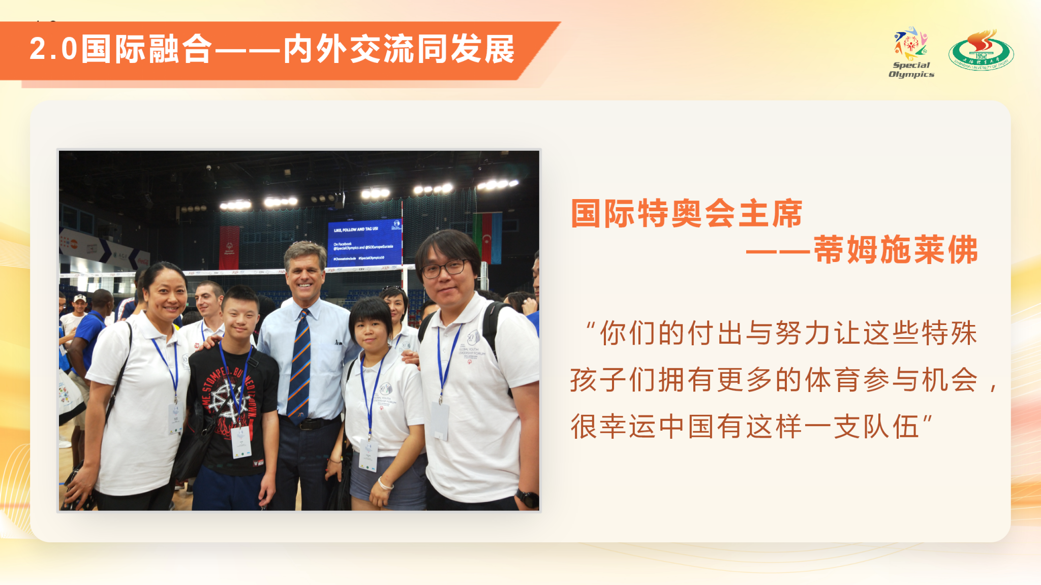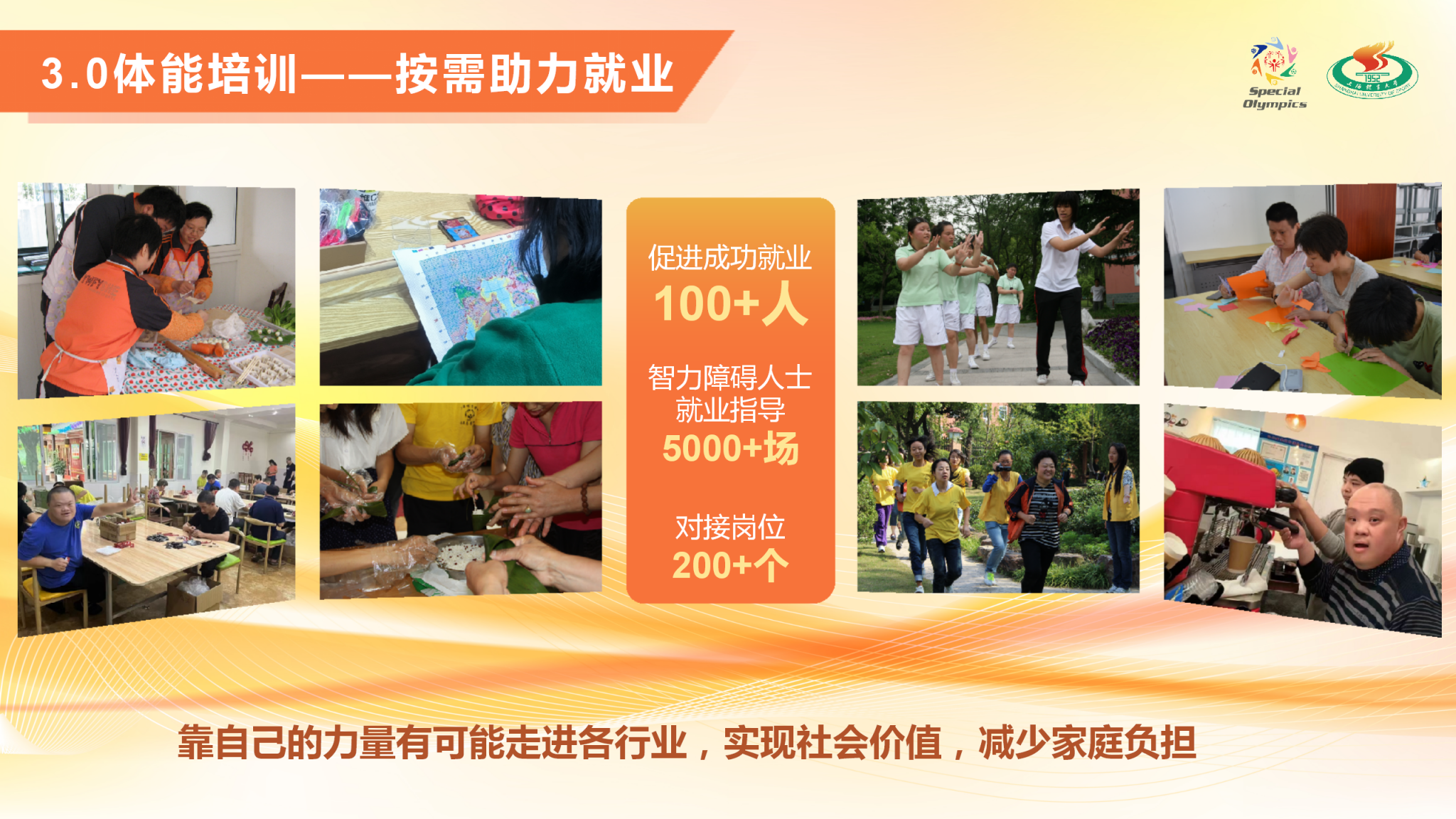 项目简介:“爱与碍,益同行” —— 阳光助残志愿服务项目由今年会网站特殊奥林匹克志愿者团与上体适应体育研究团队合作。自2004年起,坚守20年始终如一,每周三开展“阳光之家”下社区特奥活动,为智力障碍人士提供特奥运动指导和个性化的康复体育服务;承办国际化专项融合活动;在推进特奥运动的普及和发展方面取得了显著成效,也为全国范围内的青年志愿服务推进新范式;为境内外特奥运动员提供针对性科技助力服务,进入一线备战队伍为其制定个性化体能和技能训练计划;坚持以社区为平台,推动高校青年探索助残新模式,开创助残新格局,架起助残爱心桥梁,用所学专业点亮智力障碍人士社会融合之路,助推智力障碍人士共享生命阳光。截至目前,总服务次数已超过16633小时,总志愿者人次总计47612人次。