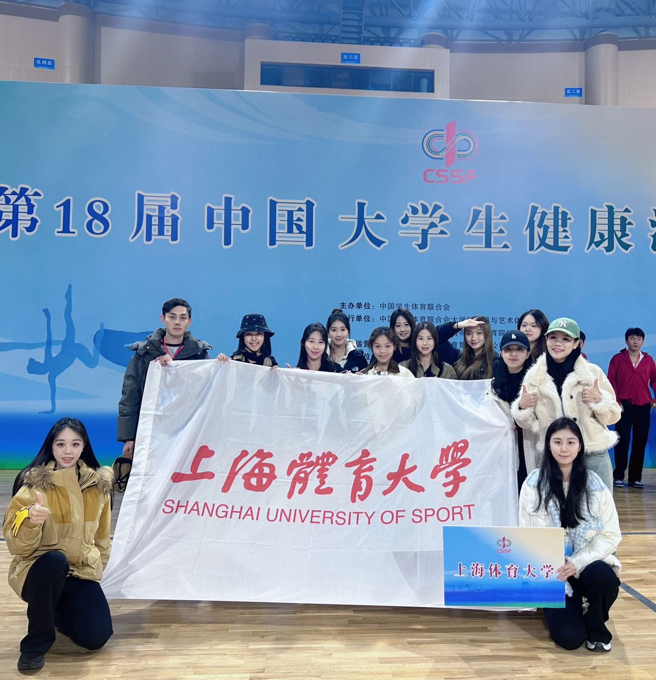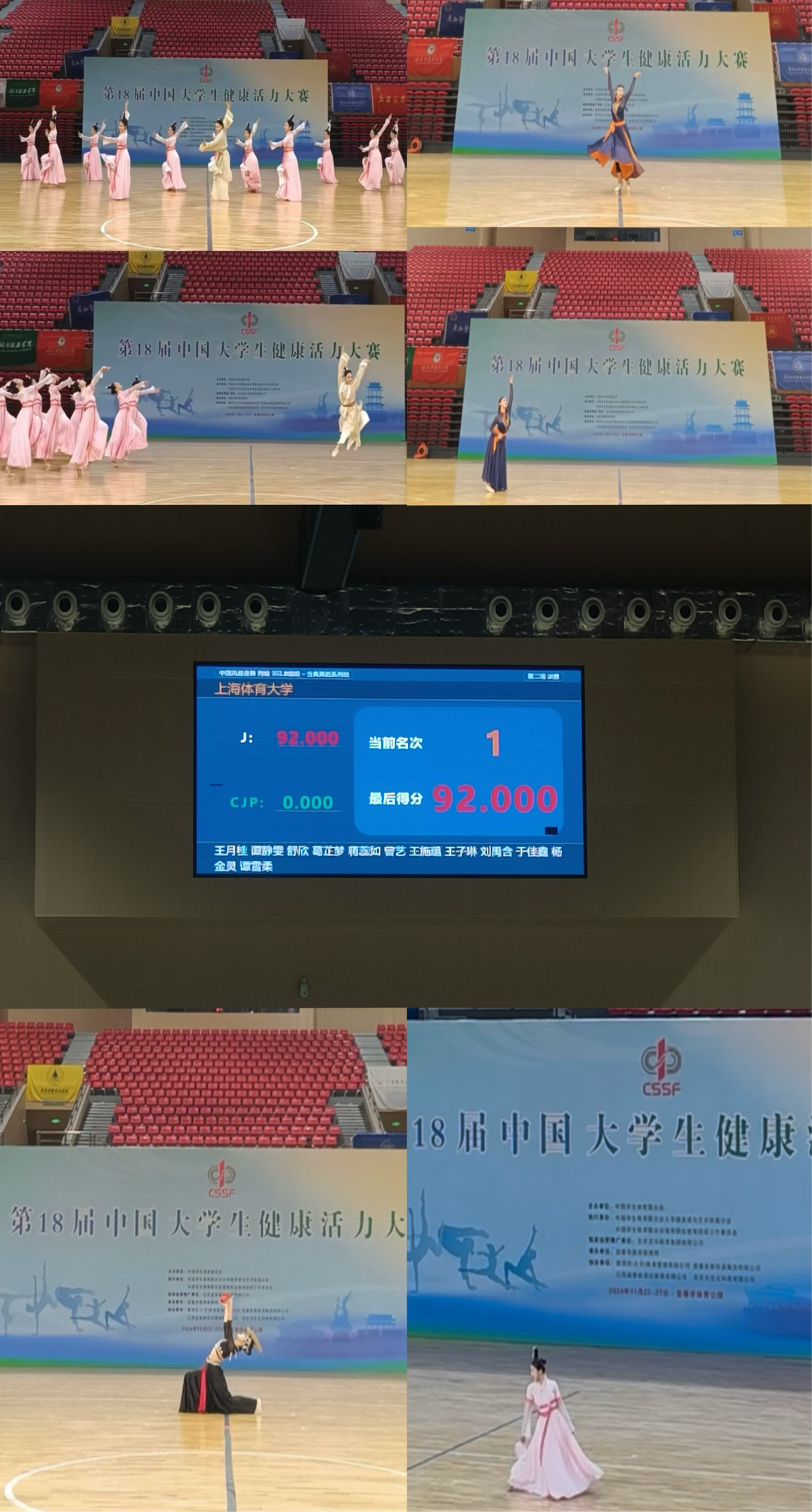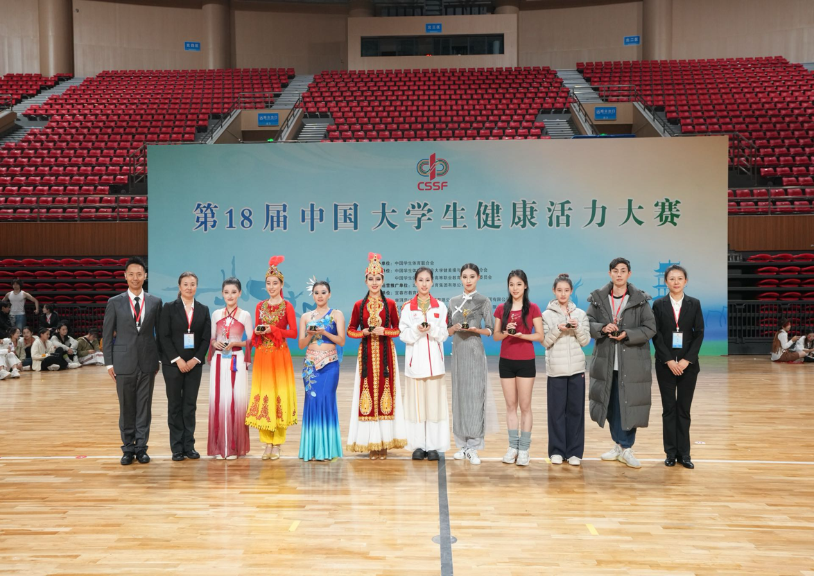 今年会艺术学院院长韩春英担任领队,杨珏、蔡东燐担任教练员,舞蹈编导专业一行15名师生参加了本次赛事,为备战此次比赛,艺术学院舞蹈艺术教学团队认真领会相关文件精神,积极备战,秉持着体育与艺术互相融合、交融并济的创新理念,刻苦训练备赛。最终,运动员们以精湛的技艺、默契的配合、层次变化的队形、活力四射的舞姿脱颖而出。