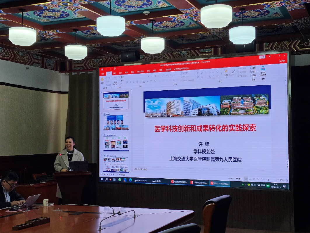 许锋以《医学科技创新和成果转化的实践探索》为题,介绍了九院发展历史,科研成果转化制度设计、政策规定等方面的成功经验,并结合医疗领域医学成果转化的现实困境,医疗机构成果转化管理工作的系统思考,以及在医疗科技成果培育、转化和设施的成功案例,为各位教师提供了面向成果转化的科研项目组织实践经验。她指出,九院2011年就成立了成果转化办公室,为医院提供更好的专业技术服务;制修订定知识产权管理和保护的系列制度文件,为成果转化提供制度保障。她强调,加强学科交叉研究,凝练共同感兴趣的科学问题,形成创新合力是成果转化的基础,设计合理、成本可控、被多数人认可、经得起验证的解决方案才有可能被转化。