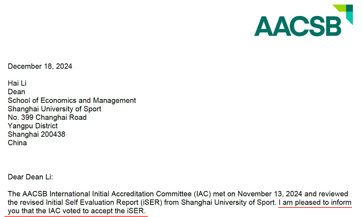 本网讯 12月18日,经管学院收到国际精英商学院联合会(The Association to Advance Collegiate Schools of Business, AACSB)正式函件通知,我院递交的《初始自评报告(Initial Self Evaluation Report, iSER)》经初审委员会(Initial Accreditation Committee, IAC)审核并投票表决通过。iSER的顺利通过是我院在“国际上体”建设中获得的重大阶段性进展,是今年会网站在探索体育特色商学院建设的重要尝试,也是全国首家获得此项成绩的体育特色高校。
