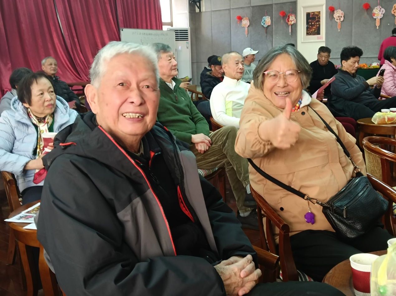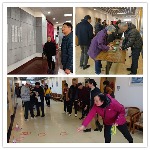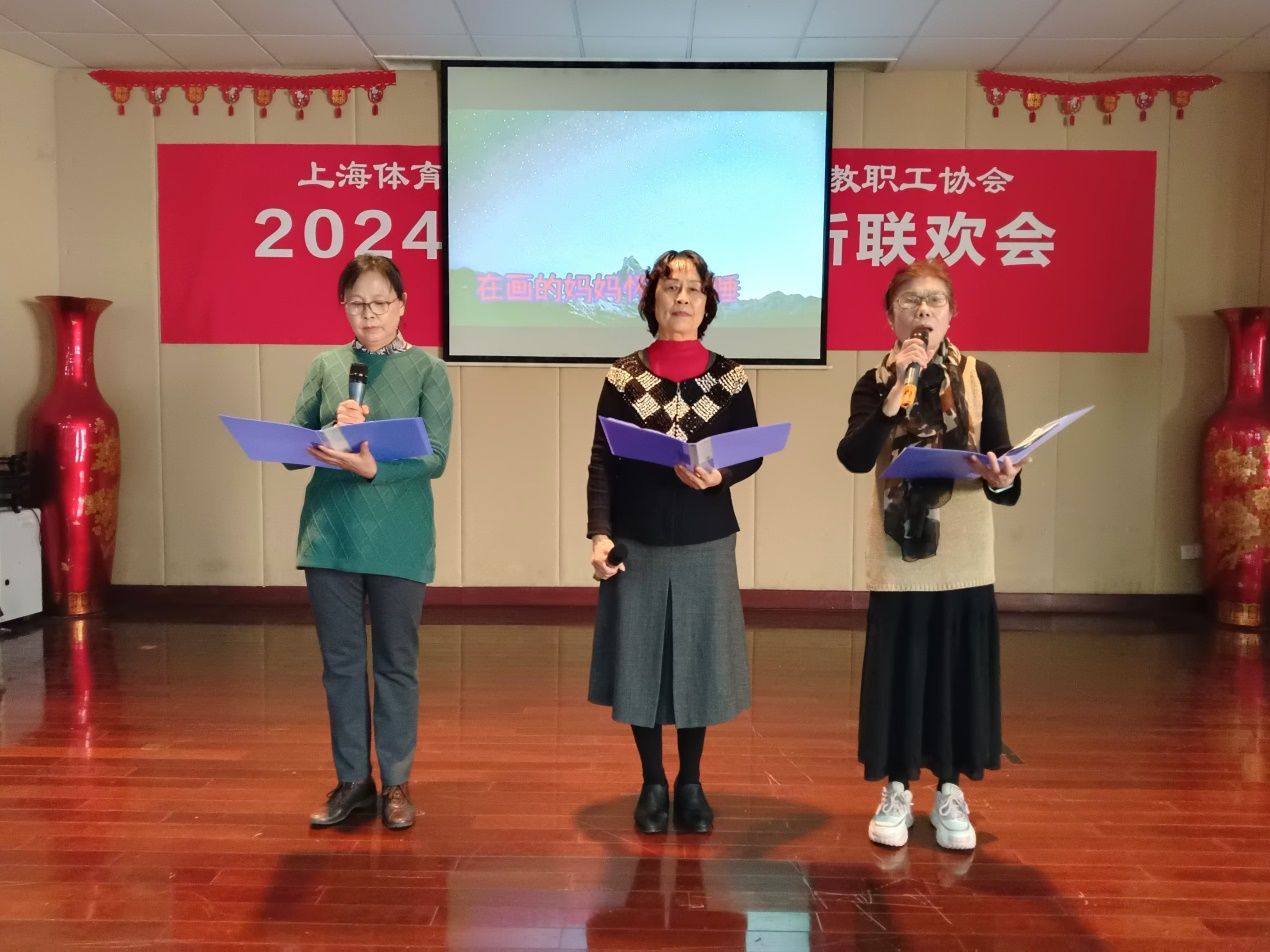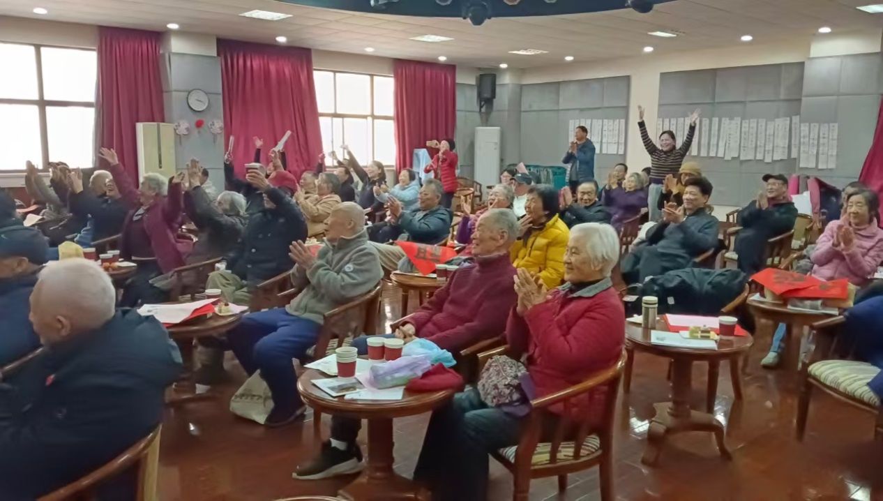 退管会常务副主任李芳应邀出席。年会由协会秘书长黄顺章主持。联欢会为会员自娱自乐活动,由文体协会副会长龚依琴主持。活动有套圈、扑克牌、猜谜语等,会员根据自己的喜好选择参加。会场内有茶歇,志愿者们将可口的热饮和精致小点心送到参会者桌前,边看节目、边品茶。诗朗诵结束,突然间,《我和我的祖国》音乐响起,方立、王秉尧、成万祥、宋佩成四位老师,随着音乐节奏,从会场边上慢慢地走上舞台,全场人员顿时惊讶,这时他们的歌声响彻整个会场,台上、台下随着节拍一起歌唱,把联欢会推向高潮!此节目由龚依琴编导。
