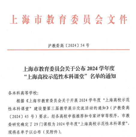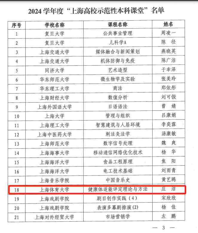 本网讯 近日,上海市教委发布《上海市教育委员会关于公布2024学年度“上海高校示范性本科课堂”名单的通知》沪教委高〔2024〕54号,确定29门课程为2024学年度“上海高校示范性本科课堂”。今年会运动健康学院《健康体适能评定理论与方法》(负责人:庄洁)课程入选。