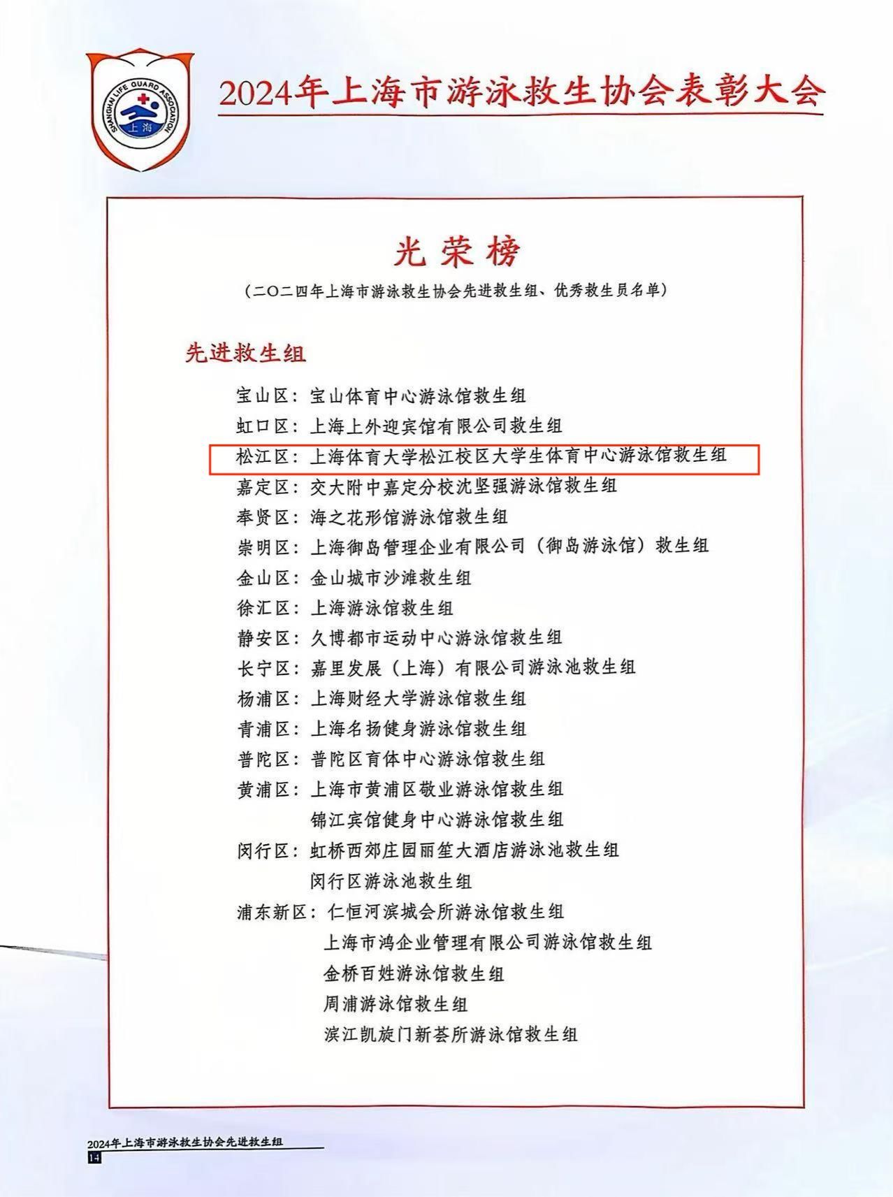 本次评选由上海市游泳救生协会联同各区体育行政管理部门和区游泳救生协会共同组织,在全市范围内共计评选出55名“2024年度优秀救生员”,22个“2024年度先进救生组”。今年会松江校区上海大学生体育中心救生组作为松江区唯一代表接受表彰。