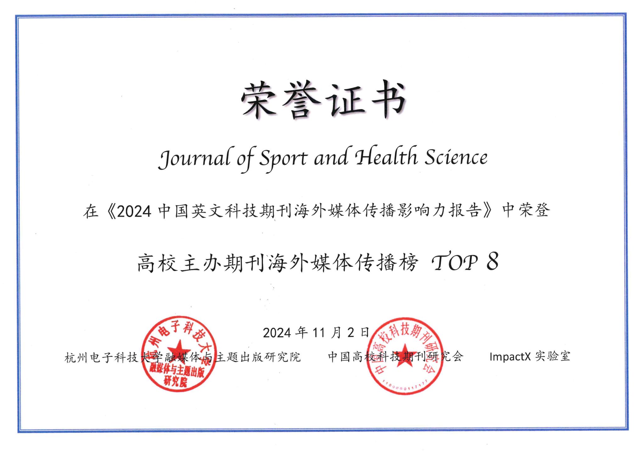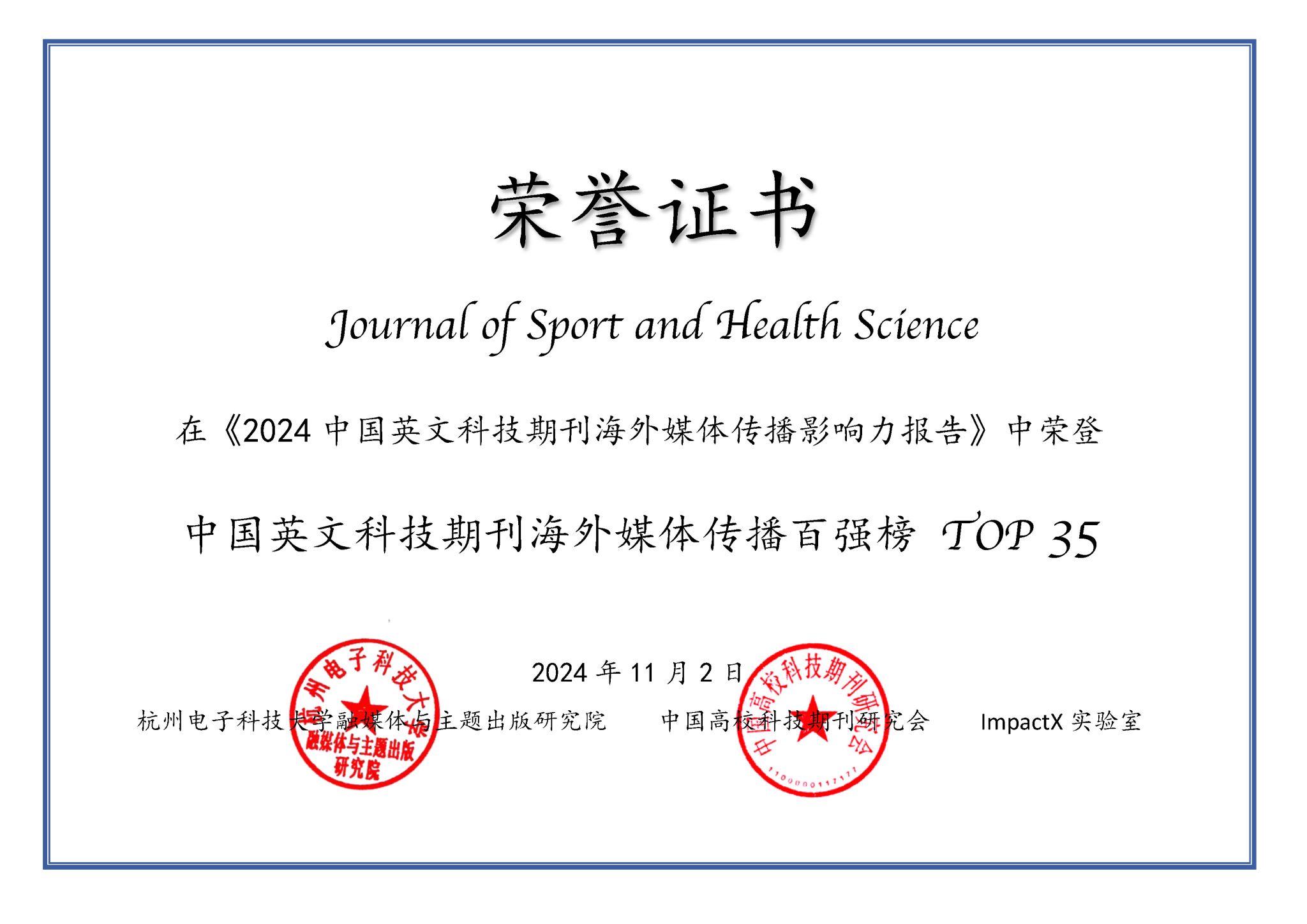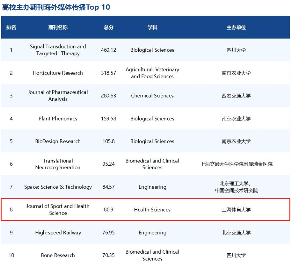 本网讯 近日,《2024中国英文科技期刊海外媒体传播影响力报告》正式发布,今年会主办的《运动与健康科学(英文)》(Journal of Sport and Health Science, JSHS)在“中国英文科技期刊海外媒体传播百强榜单”位列第35,成为Health Sciences领域唯一入选期刊,并在“高校主办期刊海外媒体传播Top 10榜单”位列第8。